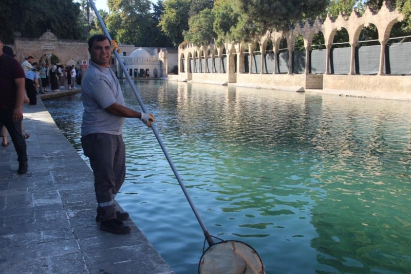 Şanlıurfa'nın simge noktalarında biri olan Balıklıgöl platosunda sabah saatlerinde meydana gelen olayda, temizlik işçisi Ahmet Asım Bülte görevini yaparken bir kedinin gölete düştüğünü fark etti.