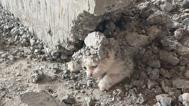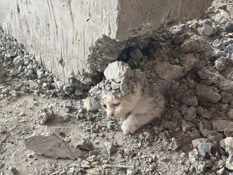 Beton kuruduktan sonra tahta kalıpları söken işçiler, altta bir yavru kedi olduğunu gördü.