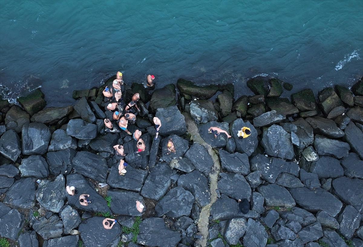 Sabah namazını Fatih ilçesinde bulunan Ayasofya-i Kebir Camii Şerifi'nde kıldıktan sonra sahile gelen grup üyeleri, kayalıklarda soyunduktan sonra bir süre koşup ısındı.