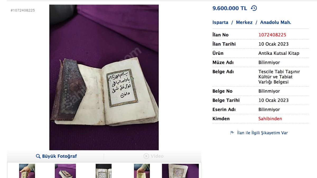 Bir internet sitesinde yer ilanda 'Asırlık el yazması Kuran ve dua kitabı' notuyla satışa sunulan Kuran-ı Kerim için tam 9.600.000 TL fiyat biçildi.