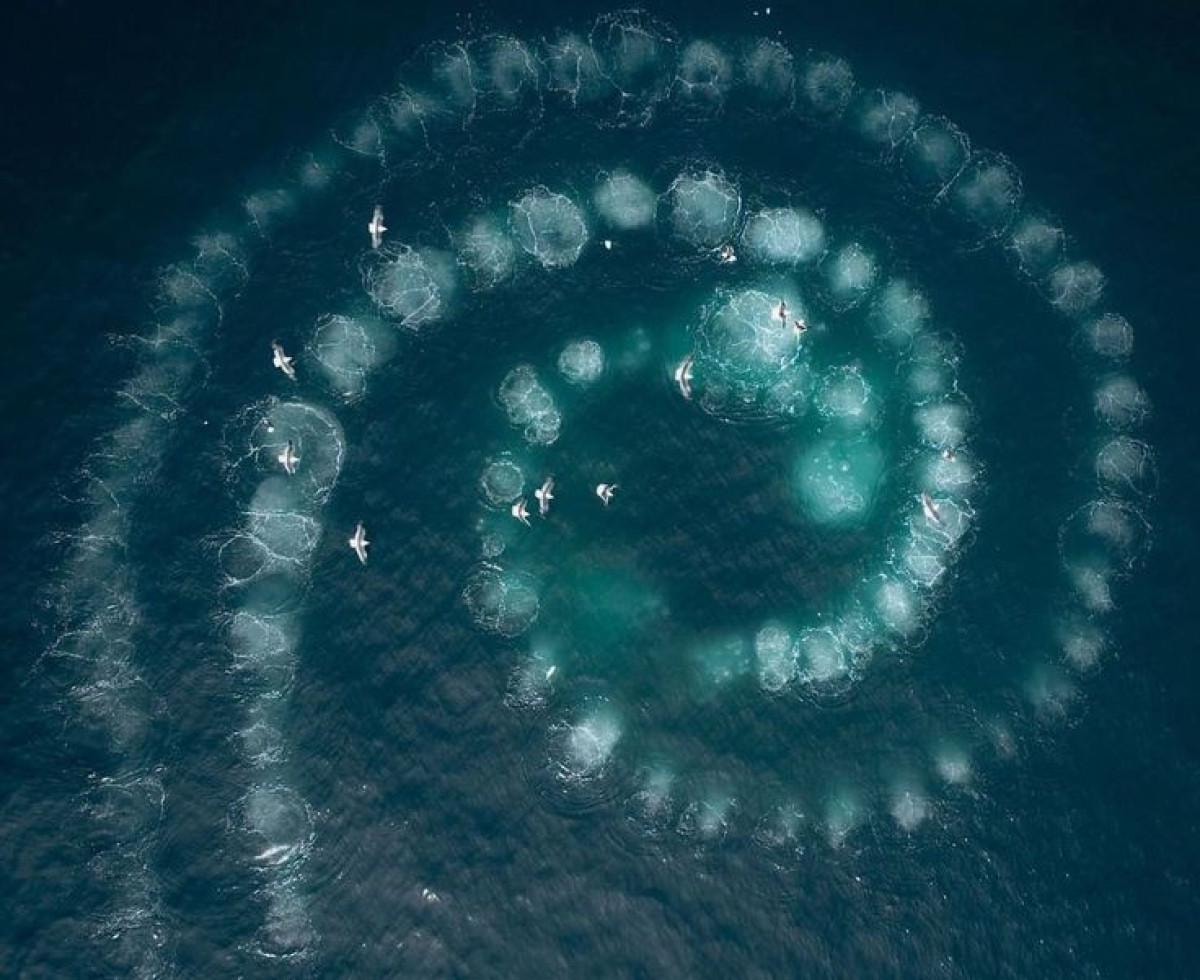 Bu ilgi çeken baloncuklar aslında baloncuklar, aslında yakınlarda dolaşan bir balinanın habercisiymiş. Özellikle kambur balinalar, avlarını sürü halinde tuzağa düşürmek için suyun altından hava üfleyerek "baloncuk ağı" adı verilen halkalar oluşturuyorlarmış.