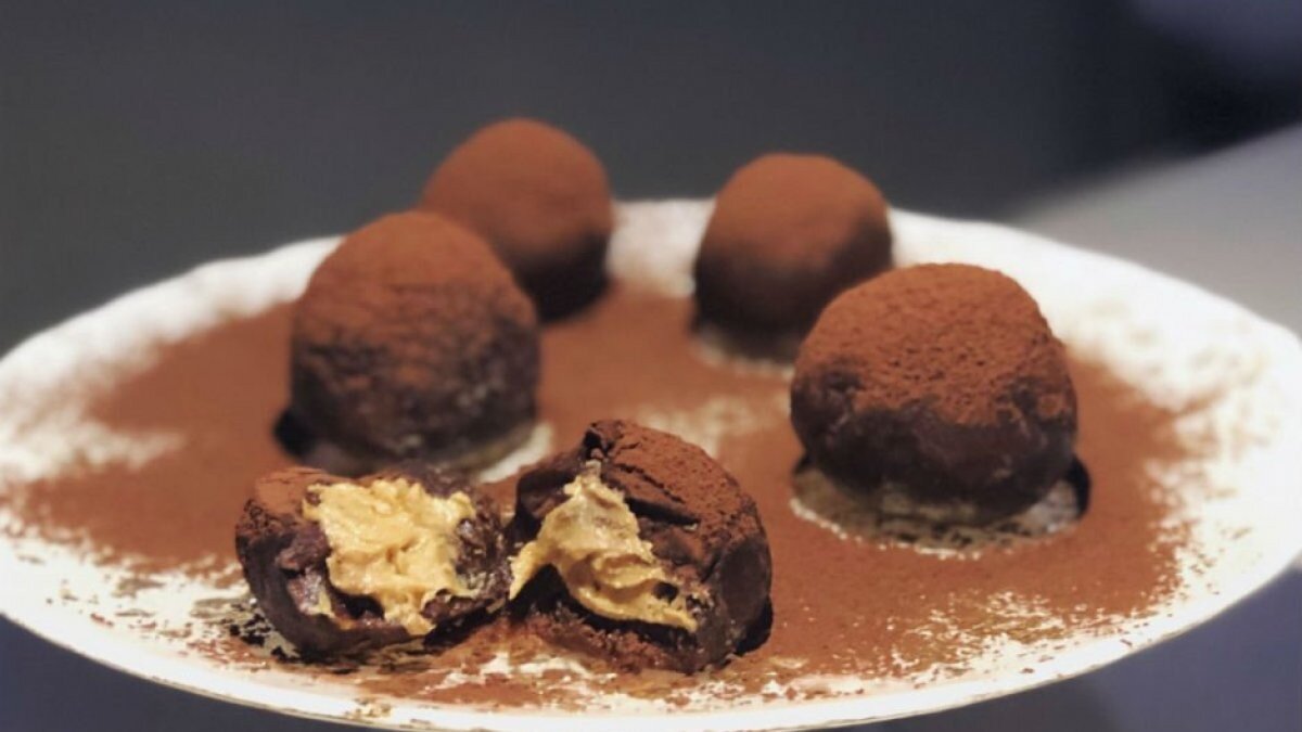 Elde ettiğimiz kıvam hurmanın yapısından ötürü biraz cıvık olacaktır ve yapımı sizi zorlayabilir. Bir ceviz büyüklüğünde elimize alalım, bastıralım ve 1 çay kaşığı fıstık ezmesi koyalım. Sonra kapatıp yuvarlayıp hindistan cevizi ya da kakaoya bulayalım.