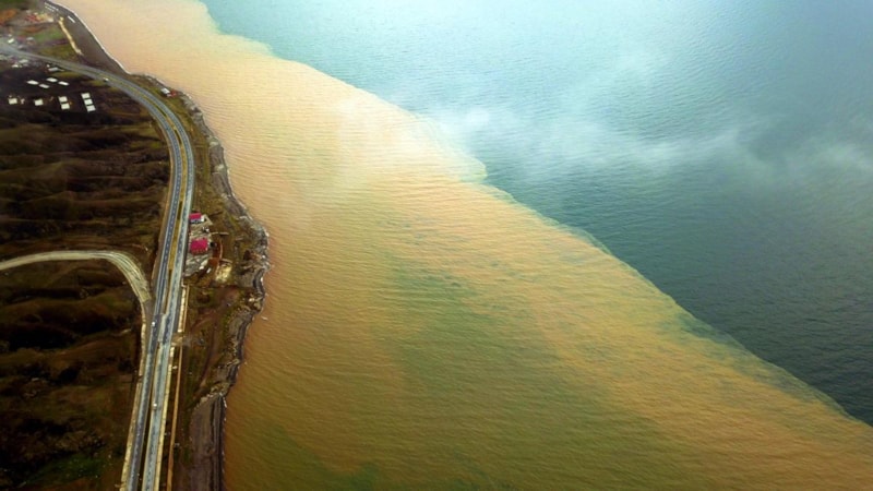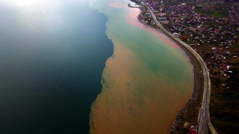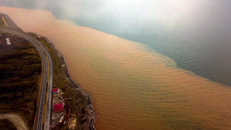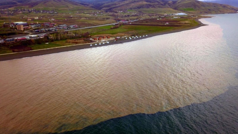 Bitlis’in Ahlat ilçesinde sel sonrası dere yataklarından dökülen suların Van Gölü üzerinde oluşturduğu görüntü havadan görüntülendi.