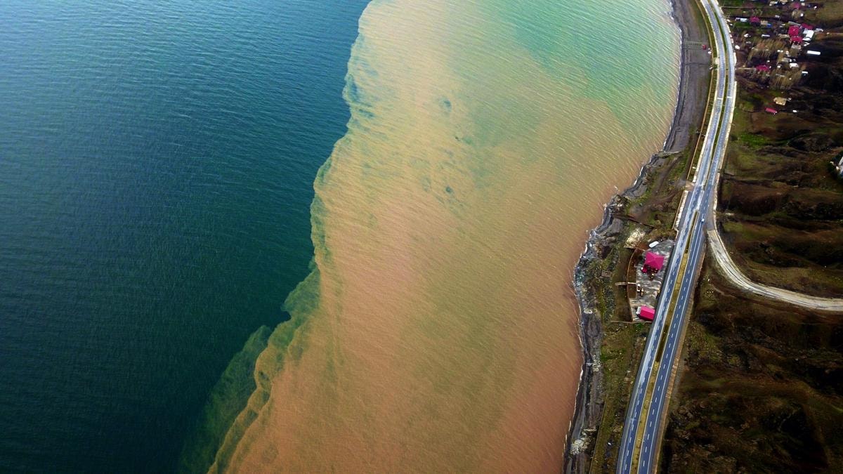 İlçenin Ahlat-Adilcevaz yolu üzerindeki 10 kilometrelik hat göle dökülen sel suları sonrası kahverengiye boyanırken, ortaya çıkan görüntü ise havadan görüntülendi.
