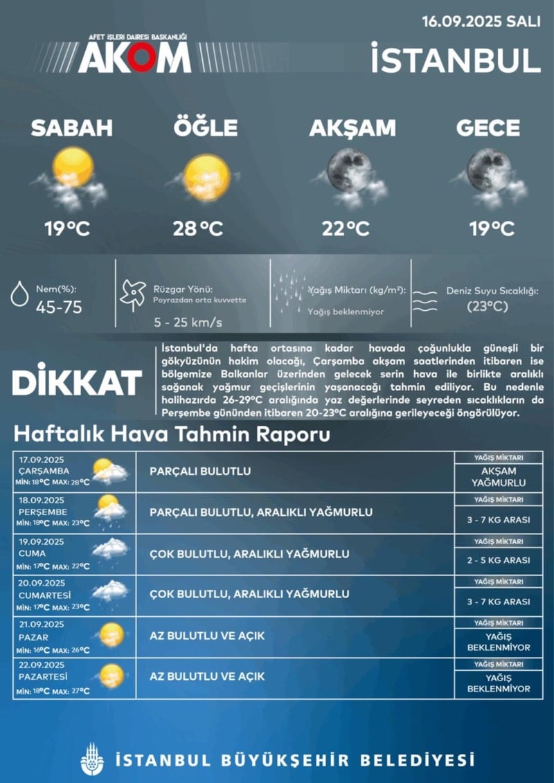 "İstanbul’da hafta ortasına kadar havada çoğunlukla güneşli bir gökyüzünün hakim olacağı, çarşamba akşam saatlerinden itibaren ise bölgemize Balkanlar üzerinden gelecek serin hava ile birlikte aralıklı sağanak yağmur geçişlerinin yaşanacağı tahmin ediliyor. Perşembe gününden itibaren sıcaklıkların 20 dereceye gerilemesi bekleniyor."