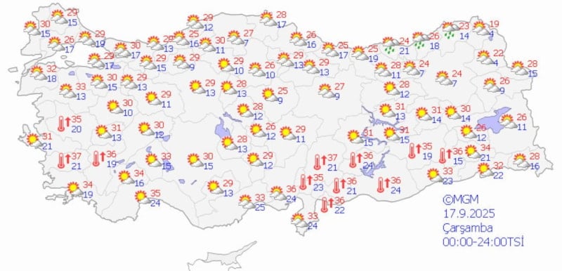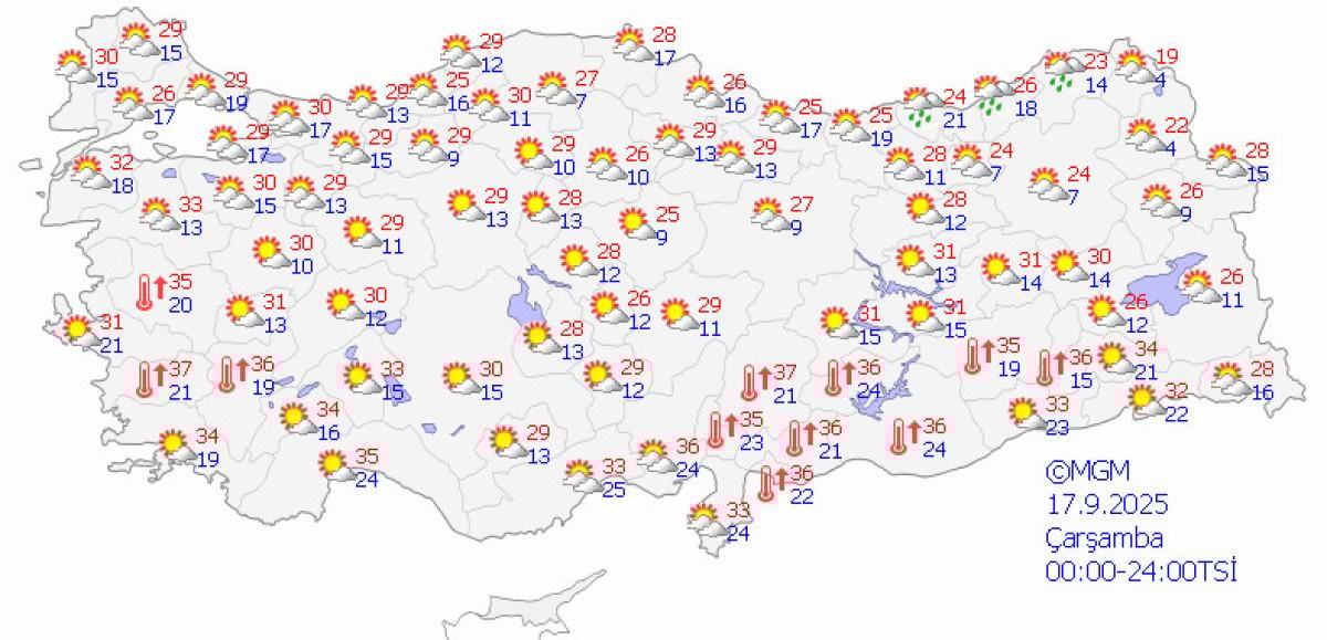 Meteoroloji Genel Müdürlüğü'nden alınan tahminlere göre, hava sıcaklıklarının Karadeniz'in iç kesimlerinde 2 ila 4 derece azalacağı, diğer yerlerde önemli bir değişiklik beklenmiyor.