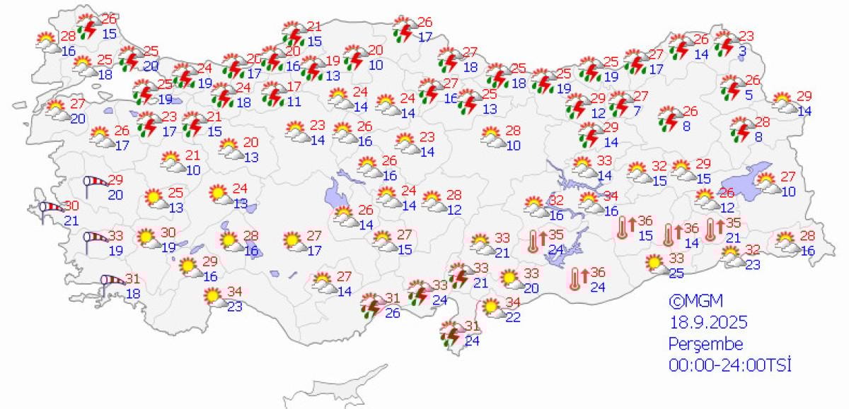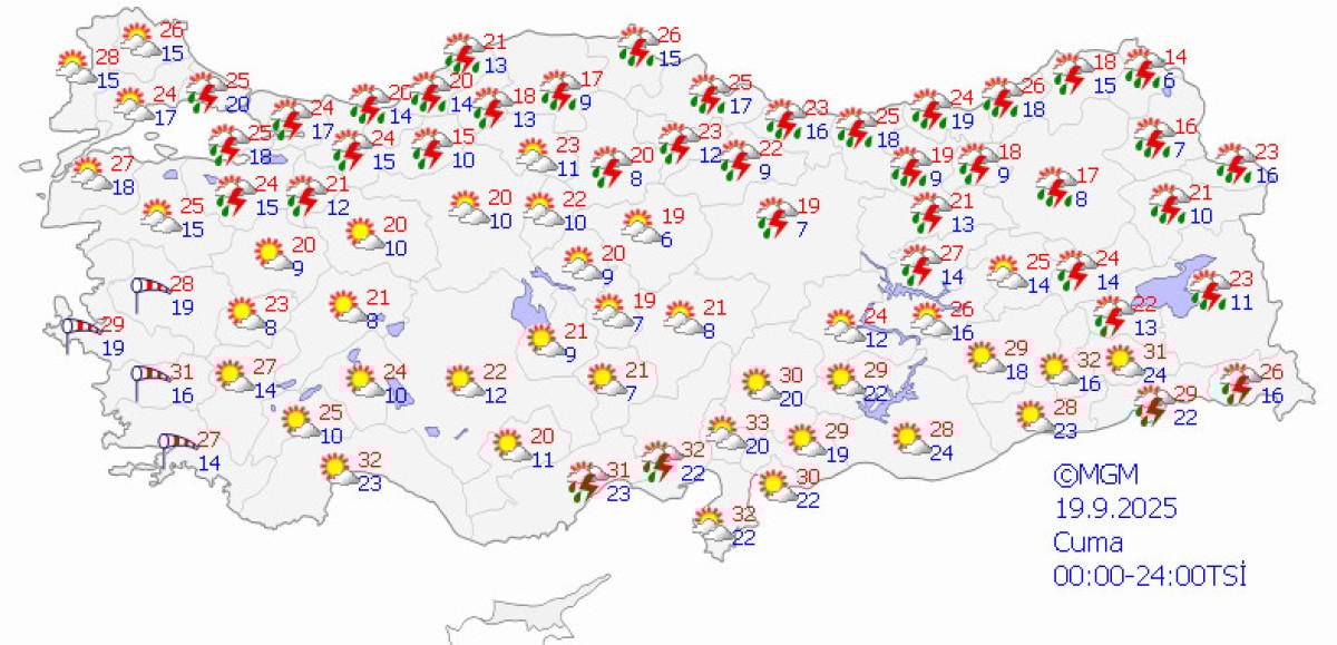 - Meteoroloji Genel Müdürlüğü, Türkiye genelinde 31 ilde gök gürültülü sağanak yağış beklendiğini duyurdu.