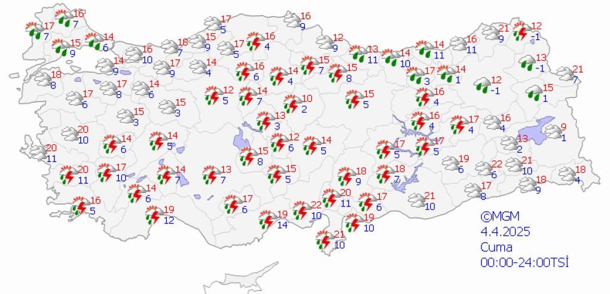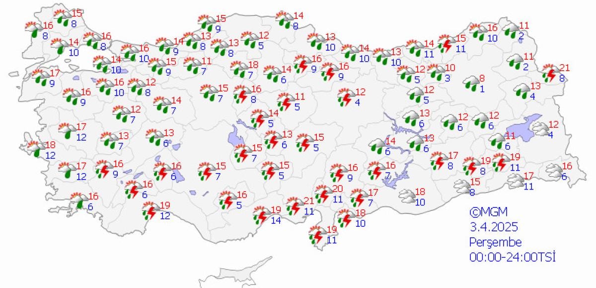 Parçalı ve çok bulutlu, aralıklı ve yerel sağanak ve gök gürültülü sağanak yağışlı
