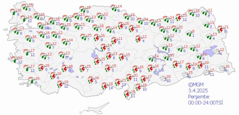 Parçalı ve çok bulutlu, sabah ve öğle saatlerinde aralıklı yağmur ve sağanak yağışlı