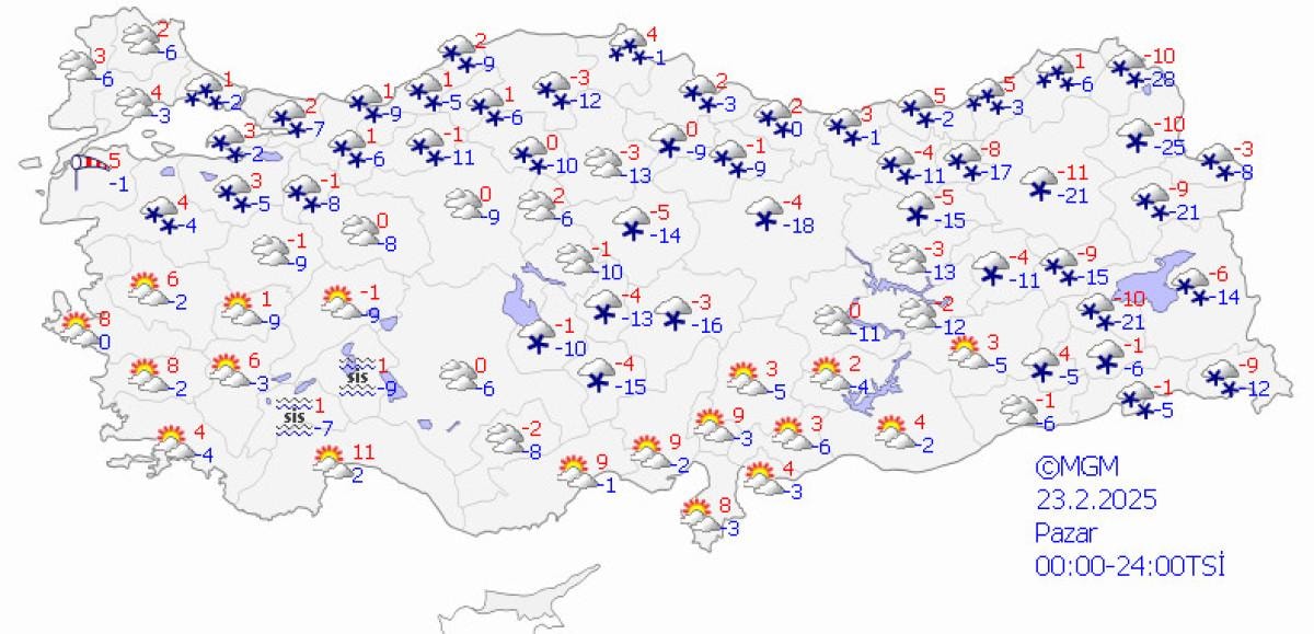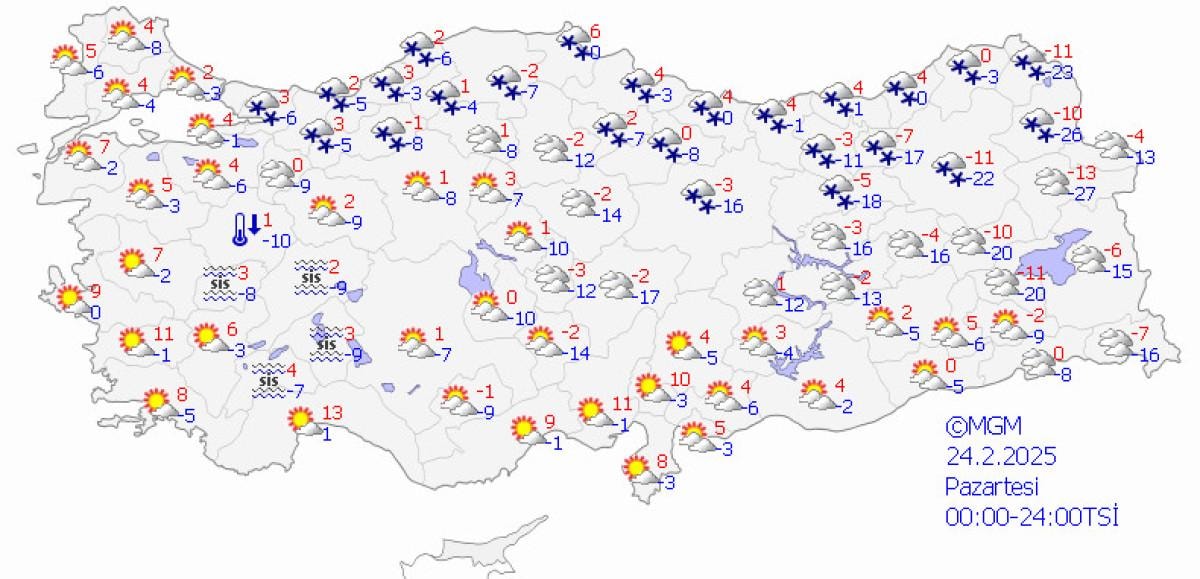 Çok bulutlu ve aralıklı kar yağışlı geçeceği tahmin ediliyor. Yağışların; öğle saatlerinden itibaren kuvvetli olması bekleniyor.