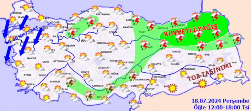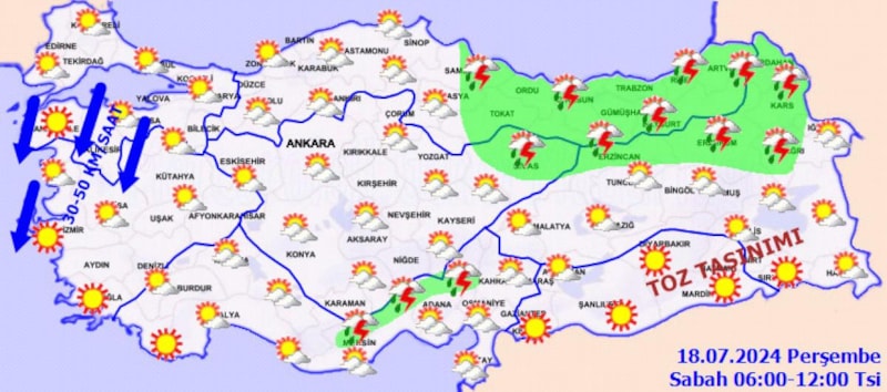 Yağışların; Doğu Karadeniz ile Doğu Anadolu’nun kuzeyinde yer yer kuvvetli olması bekleniyor. Ülkemizin güneydoğu kesimlerinde toz taşınımı bekleniyor.