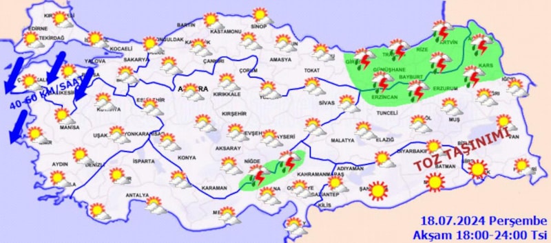 Parçalı, yer yer çok bulutlu, kuzey kesimlerinin yerel olmak üzere sağanak ve gök gürültülü sağanak yağışlı geçeceği tahmin ediliyor. Yağışların öğle saatlerinden sonra Erzincan, Erzurum, Kars ve Ardahan çevrelerinde yer yer kuvvetli olması bekleniyor.