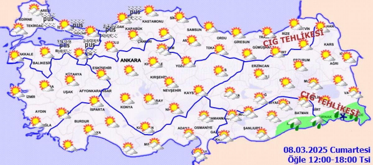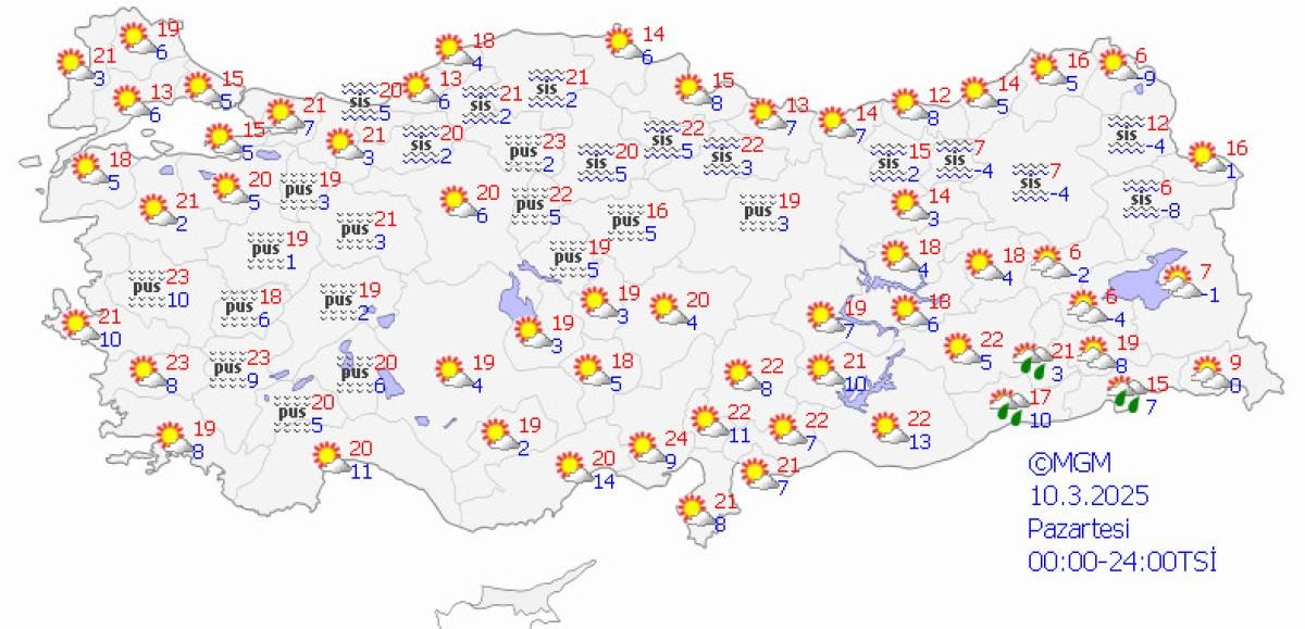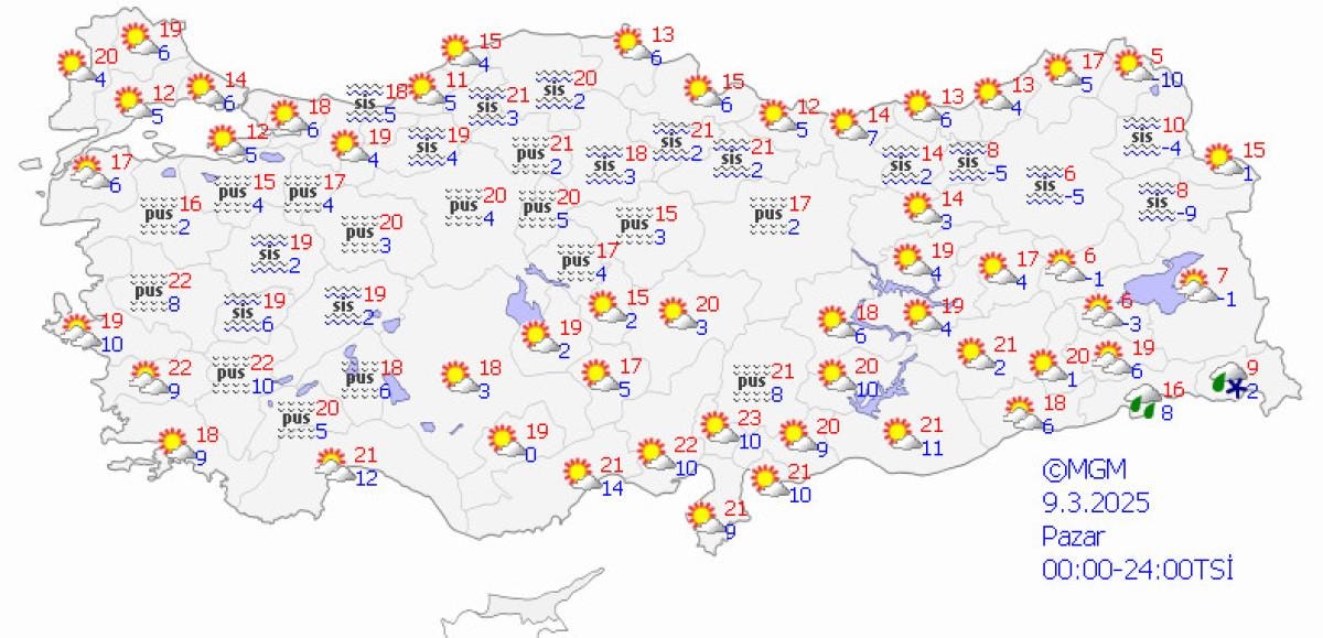 Yurdun doğu kesimlerinin parçalı, yer yer çok bulutlu; Mardin, Batman, Şırnak ve Siirt çevrelerinin yağmurlu, Hakkari çevreleri ile Van'ın güney kesimlerinin karla karışık yağmurlu, yükseklerinin kar yağışlı, diğer yerlerin az bulutlu ve açık geçeceği tahmin ediliyor. Gece ve sabah saatlerinde doğu kesimlerde buzlanma ve don, kuzey ve iç kesimlerde pus, yer yer sis bekleniyor.