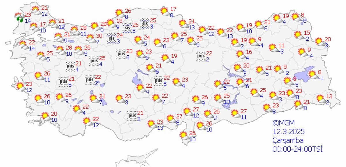 Parçalı ve az bulutlu geçeceği tahmin ediliyor. Bölge genelinde sabah ve gece saatlerinde pus ve yer yer sis bekleniyor.