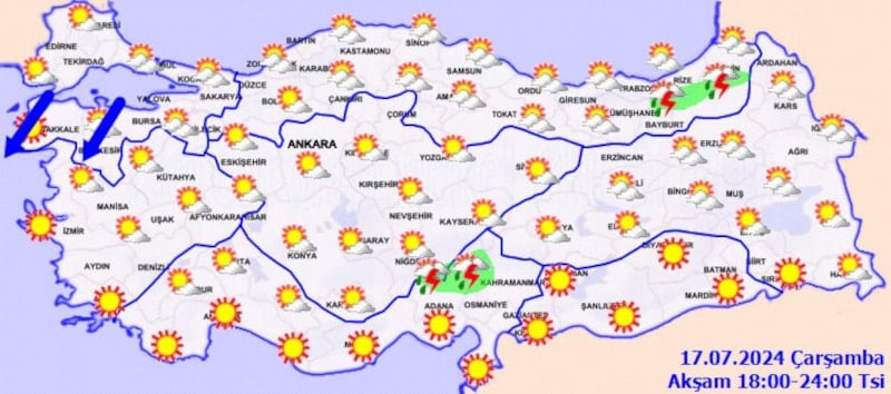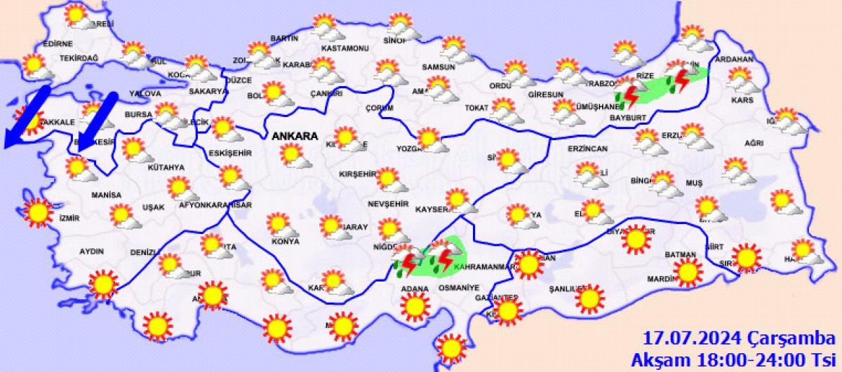 Meteoroloji Genel Müdürlüğü tarafından yapılan değerlendirmelere göre; ülke genelinin parçalı yer yer çok bulutlu, Marmara’nın güneydoğusu, Akdeniz’in iç kesimleri, İç Anadolu'nun kuzeyi, Karadeniz’in iç kesimleri, Doğu Anadolu’nun kuzeyi ile Afyonkarahisar çevrelerinin yerel sağanak ve gök gürültülü sağanak yağışlı geçeceği tahmin ediliyor.