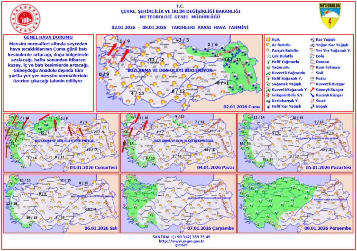 - Marmara, Ege ve Akdeniz bölgelerinde sıcaklıklar mevsim normallerinin üzerine çıkacak; İç ve Doğu Anadolu'da ise soğuklar azalacak fakat gece ayazı sürecek.