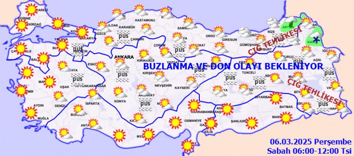 Yurdun iç ve doğu kesimlerde buzlanma ve don ile birlikte pus ve yer yer sis bekleniyor. Doğu Karadeniz’in iç kesimlerinin yüksekleri ile Doğu Anadolu’nun yüksek ve dik yamaçlarında çığ tehlikesi bulunmaktadır."
