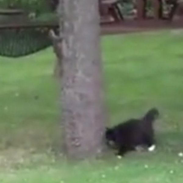 Oldukça hızlı olan sincap, kediyi peşine takarak bir sağa bir de sola savrulmasına sebep olurken, son anda kendini bir ağacın üstüne attı.