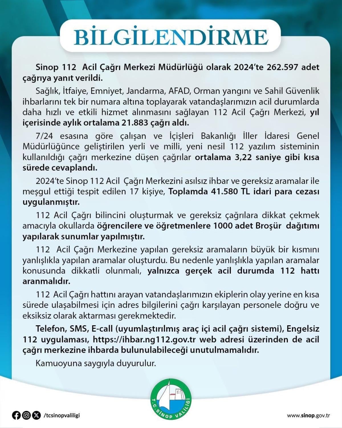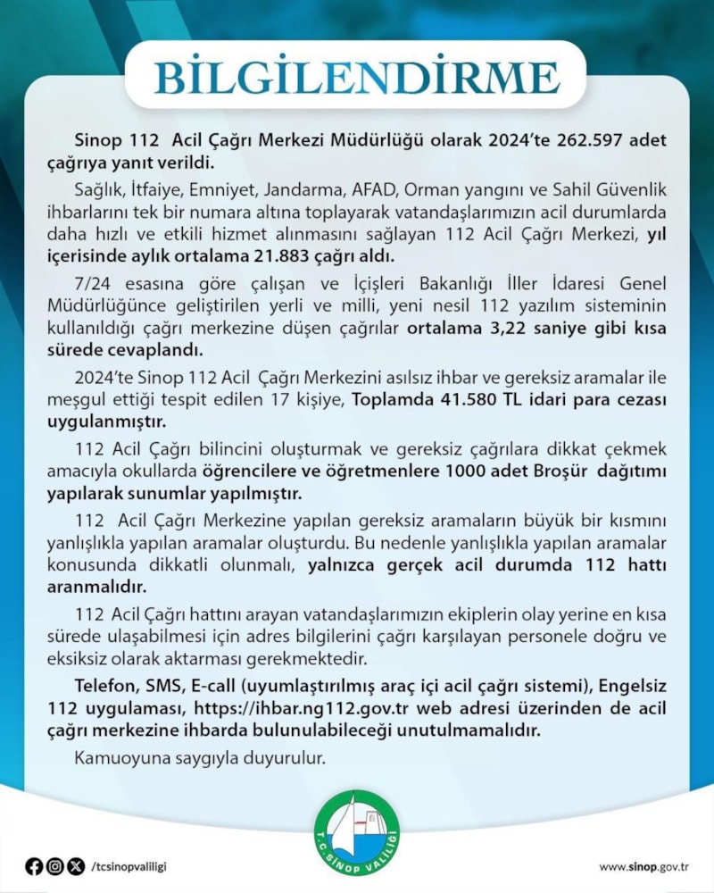 2024'te Sinop 112 Acil Çağrı Merkezi'ni asılsız ihbar ve gereksiz aramalar ile meşgul ettiği tespit edilen 17 kişiye, toplamda 41 bin 580 TL idari para cezası uygulandı.
