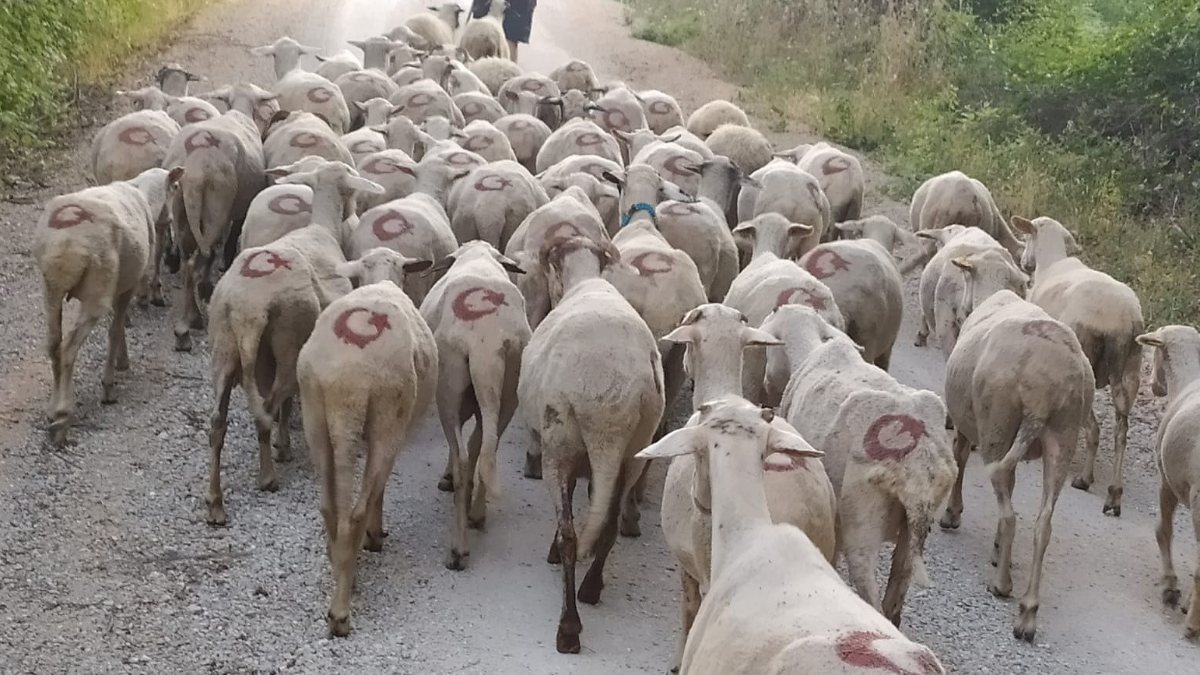 Çelik hiç üşenmeden hazırladığı şablon ile yaklaşık 70 koyunun üzerine tek tek kırmızı sprey boya ile ay yıldız çizdi.