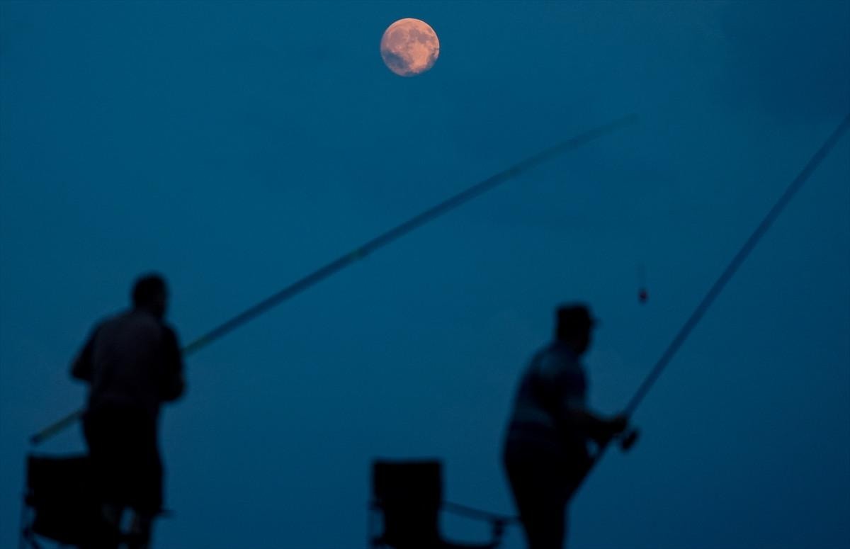 Sinop'ta sahilde bulunan balıkçılarla birlikte ay manzarası güzel görüntüler oluşturdu. Kentteki manzara, masalları anımsattı.