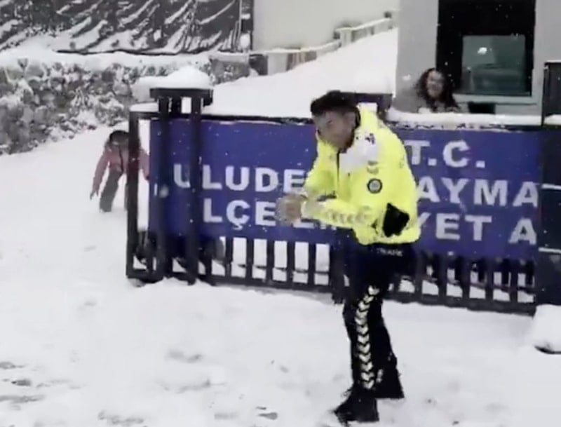 Uludere ilçesinde çocuklar, tatili fırsat bilerek kartopu savaşı yapmayı ihmal etmezken çocuklara polis ekipleri eşlik etti.