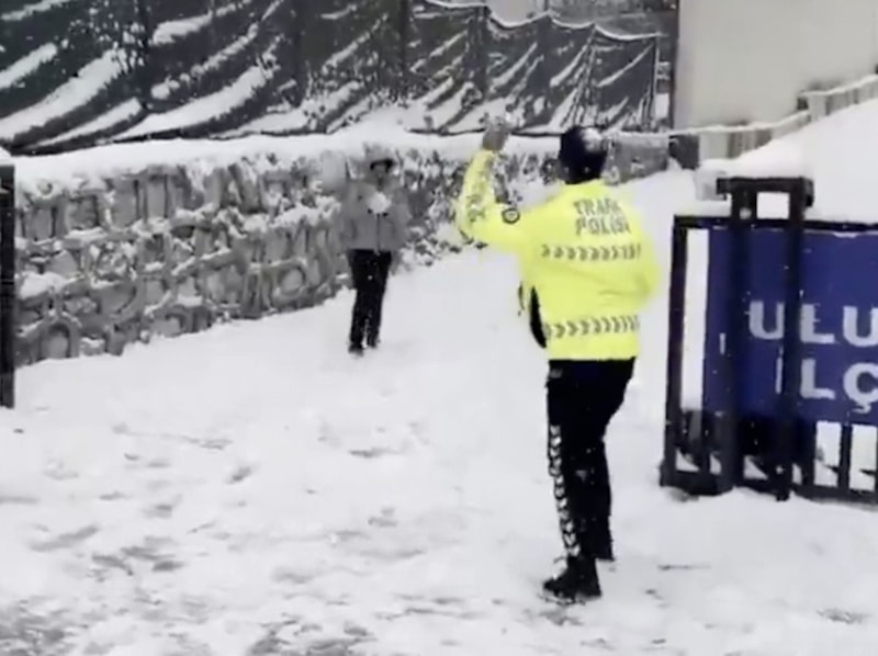 Uludere ilçesinde etkili olan kar yağışı sonrası okullar yarın da Çarşamba günü de iptal edilirken kentte çocuklar ile polis ekiplerinin kartopu savaşı yaptığı renkli anlar kameraya yansıdı.