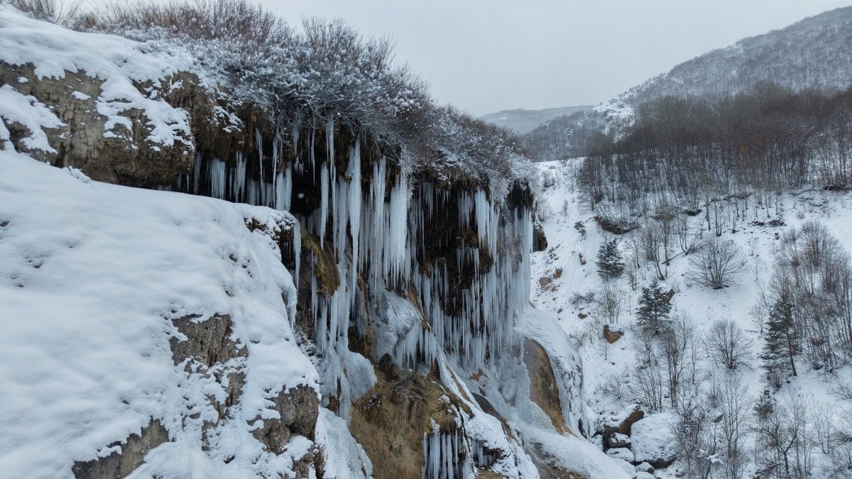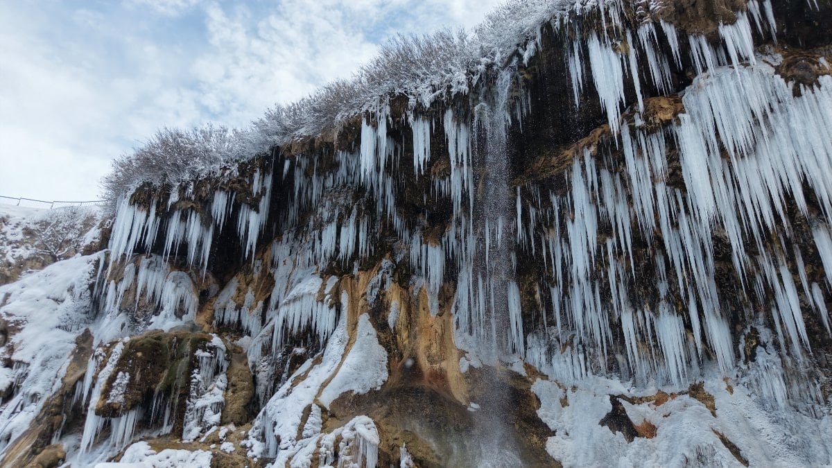 Bugünlerde kar yağışı ve soğuk havanın etkili olduğu bölgede, şelalede dev buz sarkıtları oluştu.