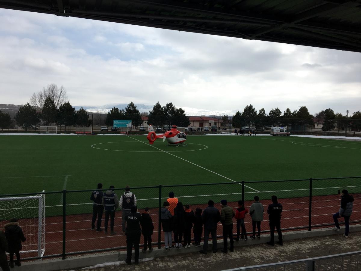 Taraftarlar maçın iptal olduğunu düşünürken ambulans helikopter sahaya iniş yaptı.
