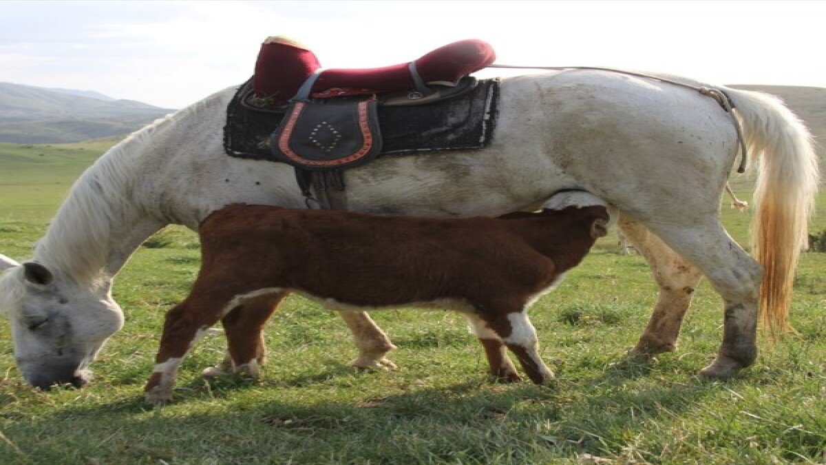 Sivas'ın Zara ilçesine bağlı Yayıközü köyü Oluklu Yaylası'nda köy muhtarı Abdullah Solak'a ait annesi olmayan danayı, 15 gündür "Aktolgalı" isimli at emziriyor.