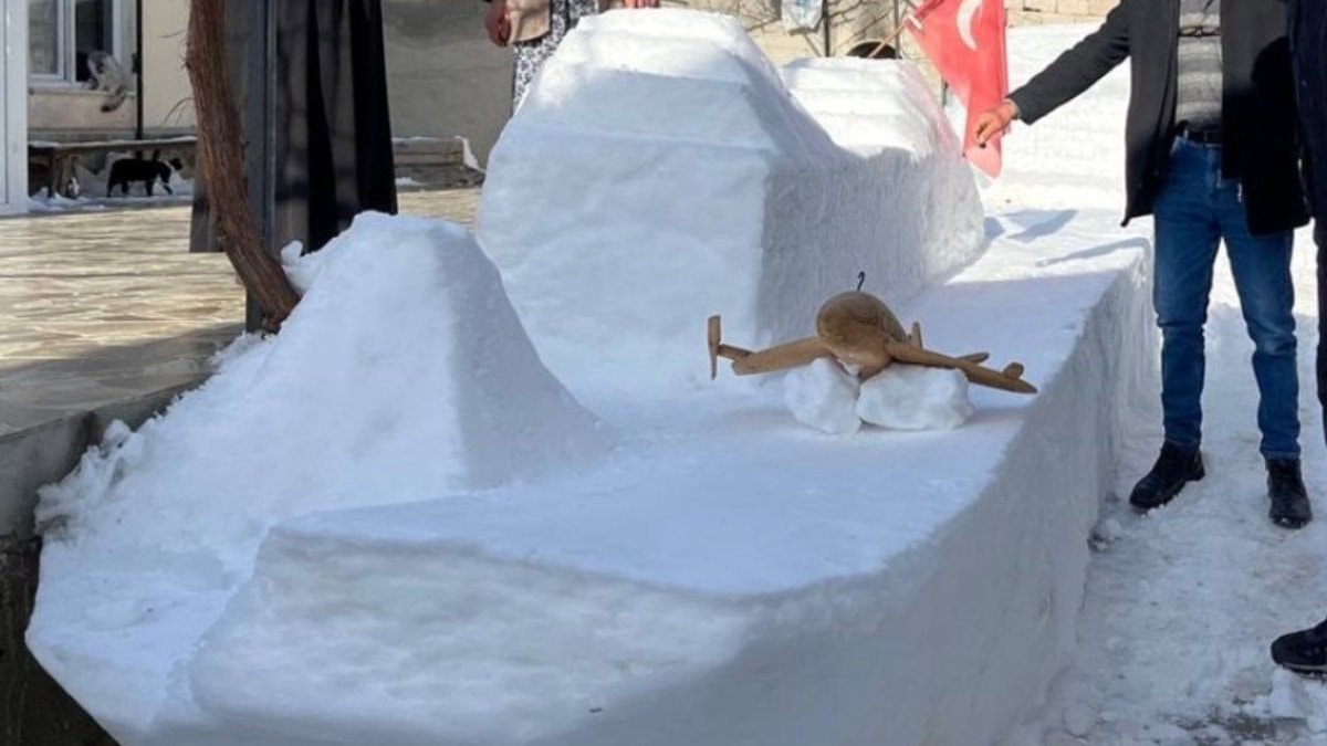 İlçeye bağlı Arpaözü köyünde yaşayan Sözay Aslan, evinin önüne kardan araç ve gemi yaptı.