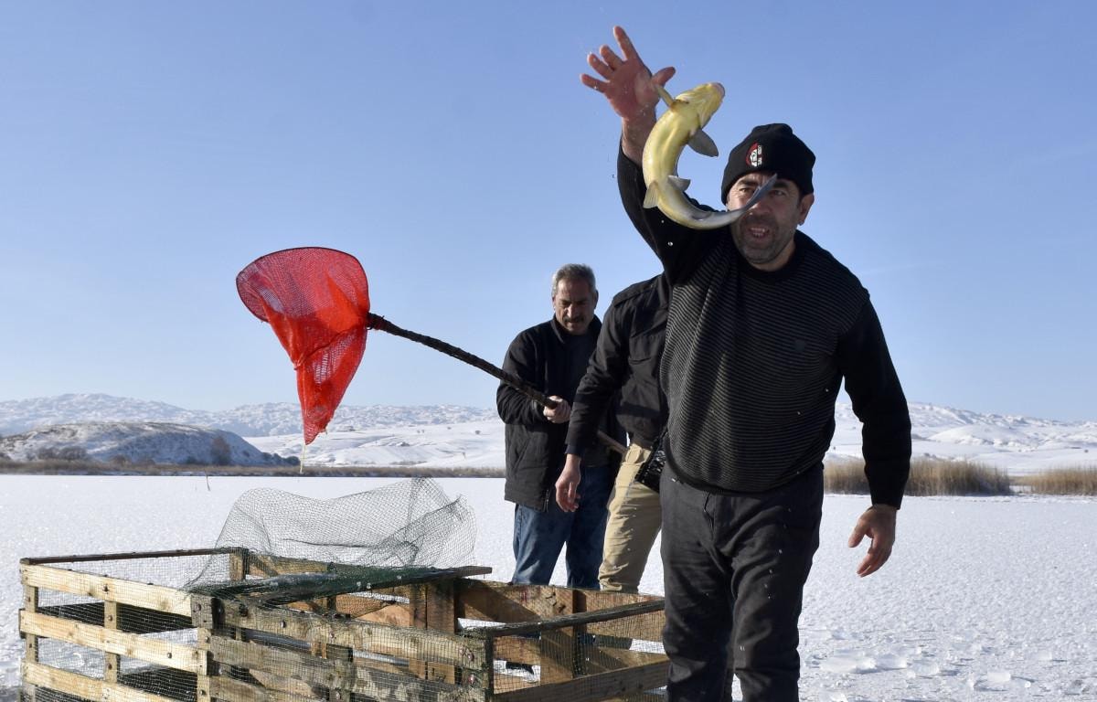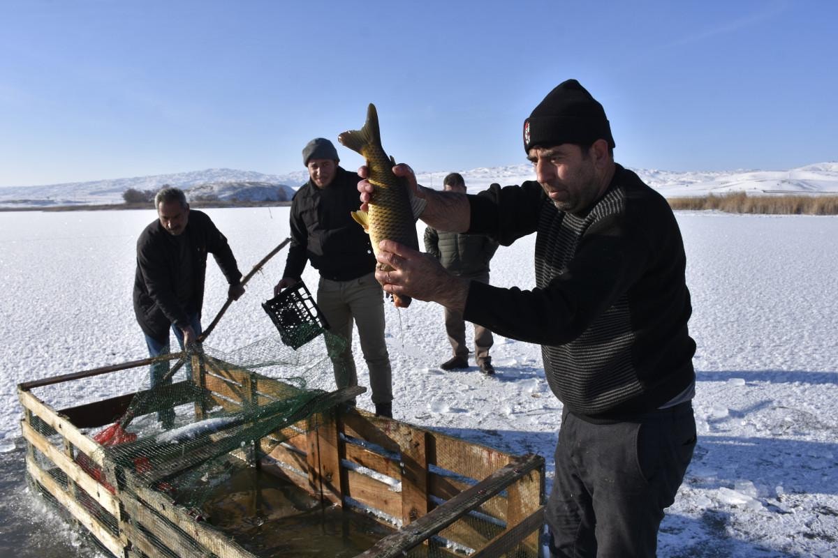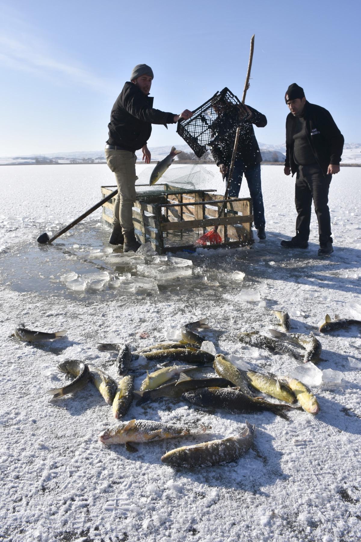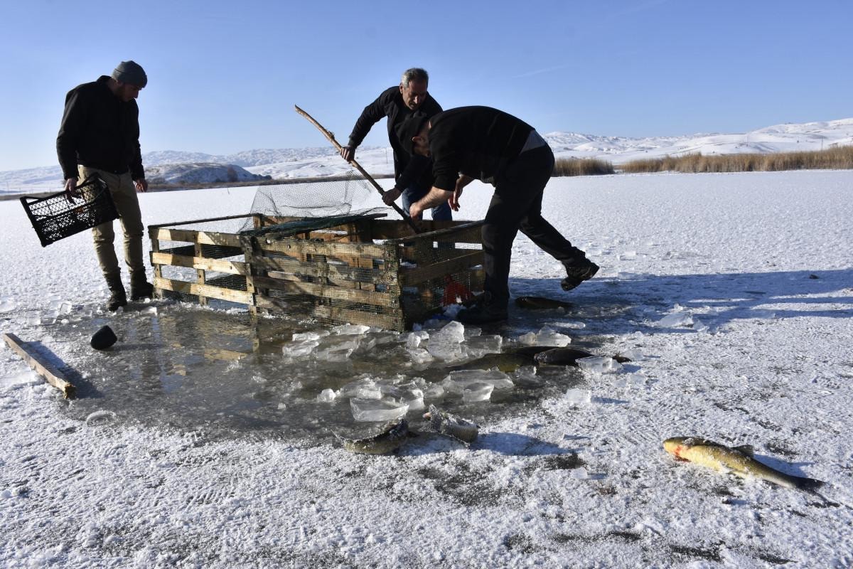 Hafik Gölü'nün yüzeyinin yaklaşık 2-3 ay boyunca buzla kaplı kaldığını belirten Kadir Coşkun, "Burada sıcaklık eksi 15'e düşünce göl donuyor. Buz tutunca da uzun süre kalıyor. Havanın durumuna göre 2-3 ay buzlu kalıyor. Yüzey buz tutunca buzları kırıp balıklara hava aldırıyoruz. Buz kırılmazsa balıklar ölüyor. Aynı zamanda da yemek için de avlanma yapıyoruz. Burada sazan, gümüş, çay balığı gibi çeşitler var" dedi.
