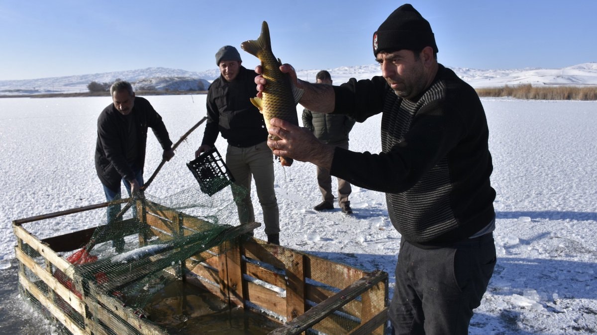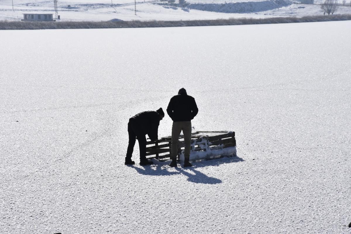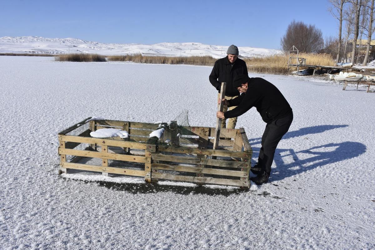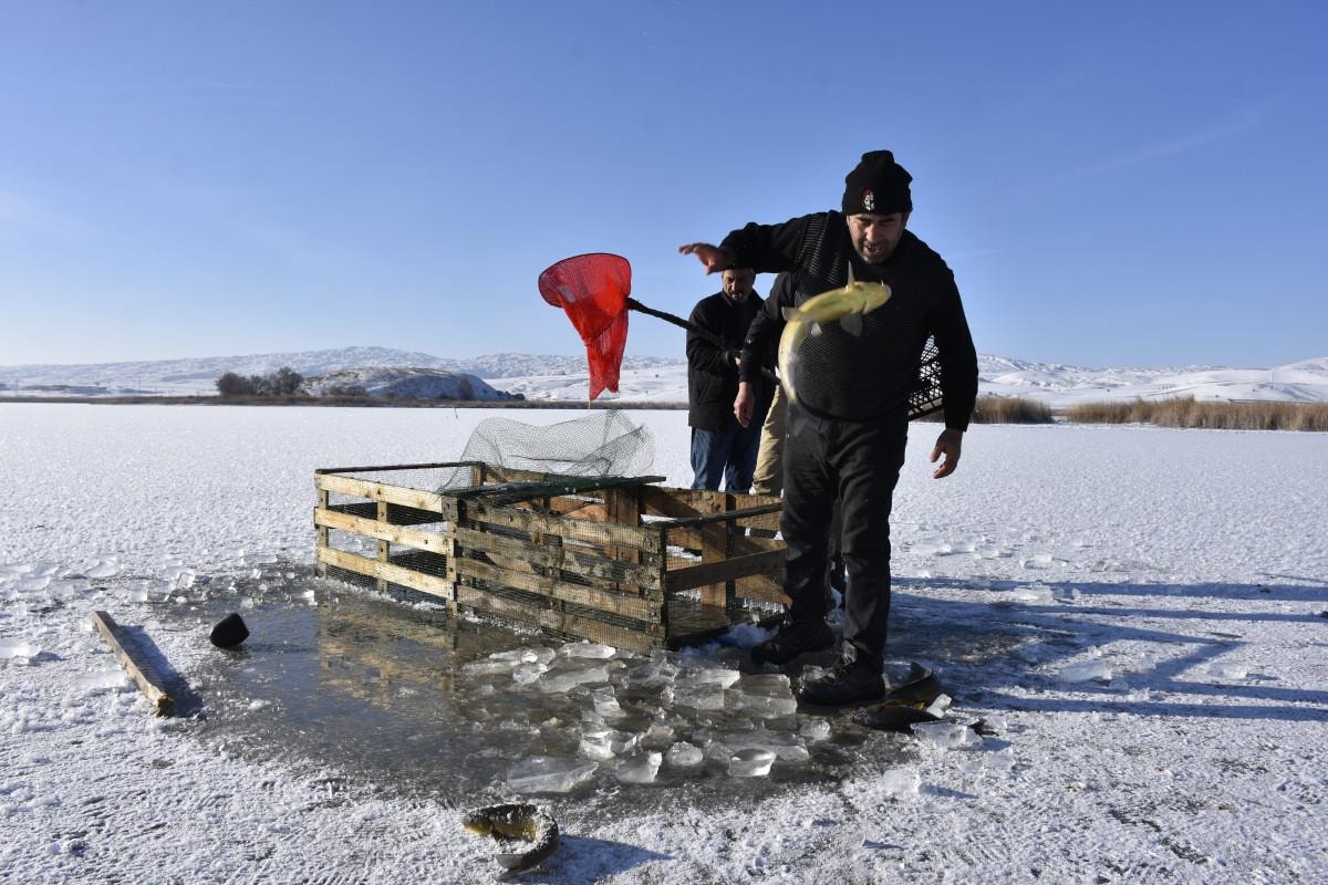 Hafik Gölü'nün yüzeyinin yaklaşık 2-3 ay boyunca buzla kaplı kaldığını belirten Kadir Coşkun, "Burada sıcaklık eksi 15'e düşünce göl donuyor. Buz tutunca da uzun süre kalıyor. Havanın durumuna göre 2-3 ay buzlu kalıyor. Yüzey buz tutunca buzları kırıp balıklara hava aldırıyoruz. Buz kırılmazsa balıklar ölüyor. Aynı zamanda da yemek için de avlanma yapıyoruz. Burada sazan, gümüş, çay balığı gibi çeşitler var" dedi.