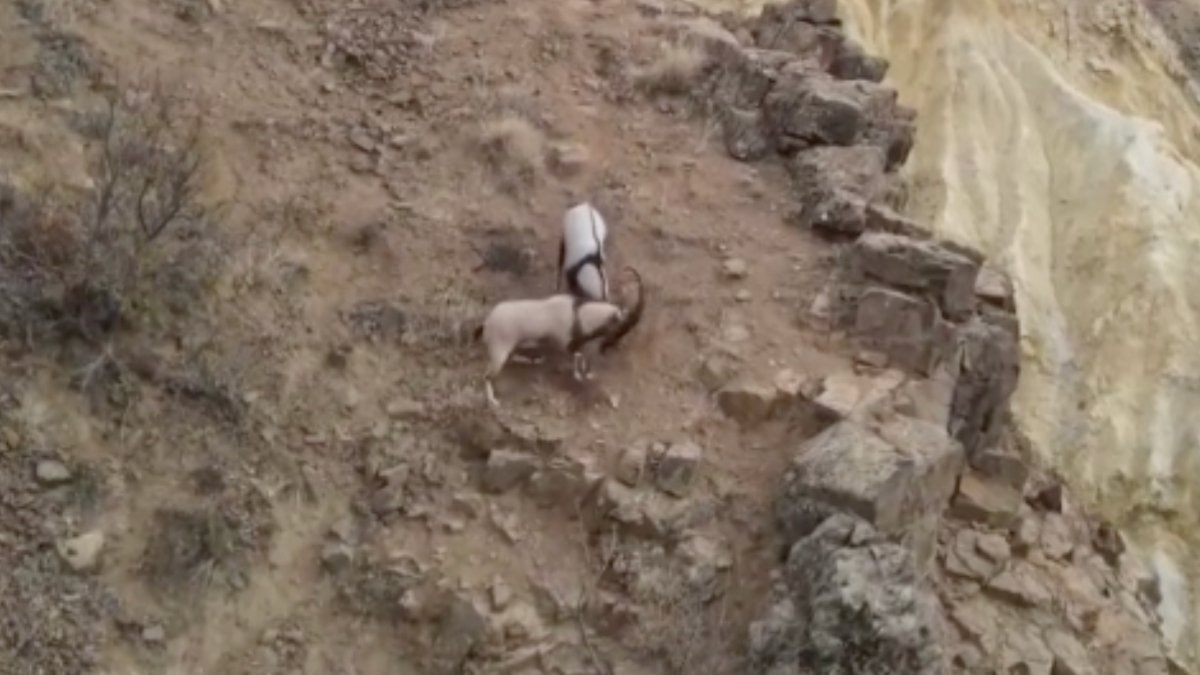 Drone'lerle yapılan çekimlerde kameralara yansıyan görüntülerde heybetli boynuzlarıyla uçurumun kıyısında kafalarını tokuşturan keçilerin nefes kesen kavgası net şekilde görüldü.