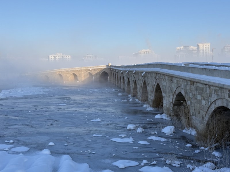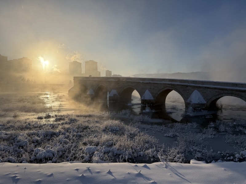 Tarihi Eğri Köprü civarındaki bölümlerde suyun sakin aktığı kısımlarda da buz tabakası oluştu.