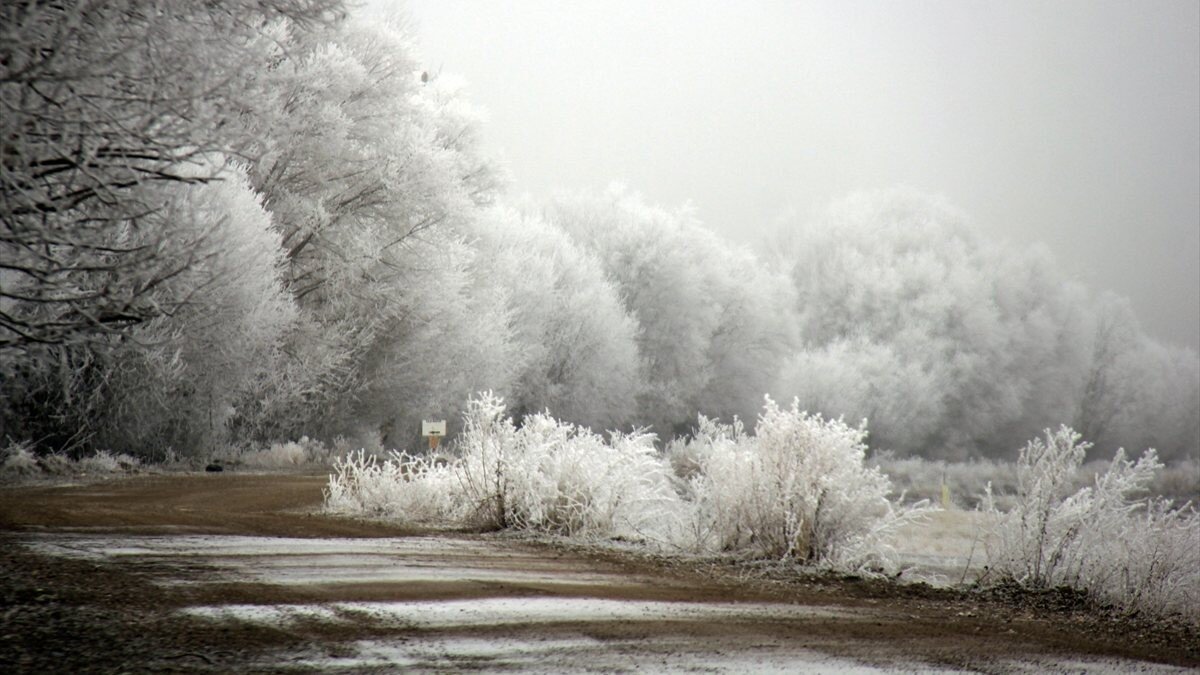 Sivas-Erzincan kara yolu üzerindeki 1453 rakımlı Seyfebeli Geçidi'ni çevreleyen meyve ve çam ağaçlarında oluşan kırağı, bölgede etkili olan sisle bütünleşince görsel şölen sundu.