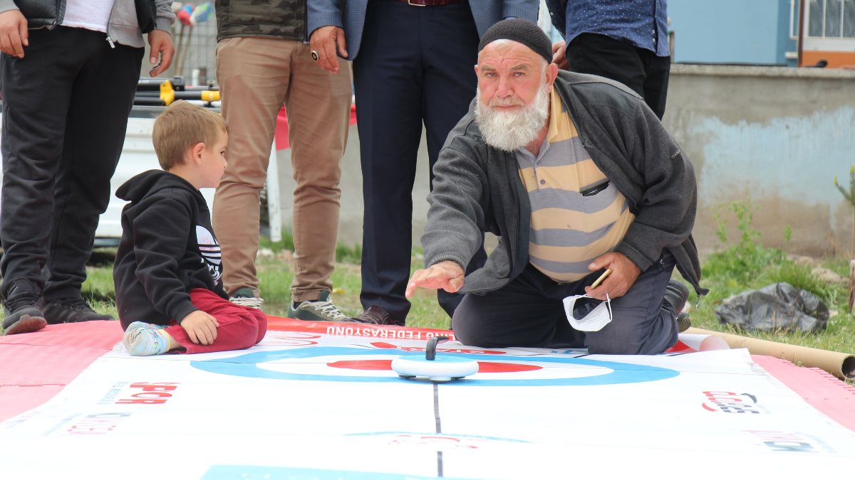 Köy merkezindeki bir zemininin üzerine kurulan Floor Curling oyun alanına gelen köy halkına antrenörler floor curling sporunun kurallarını ve oynanış şekli anlattı.