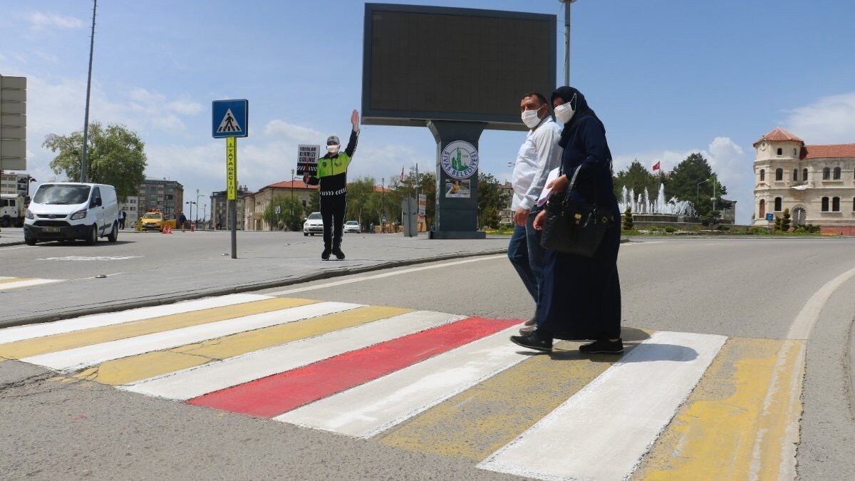 Vali Ayhan ve Başkan Bilgin, koronavirüse de dikkat çekmek için yaya geçidine monte edilen maket trafik polisine maske taktı.