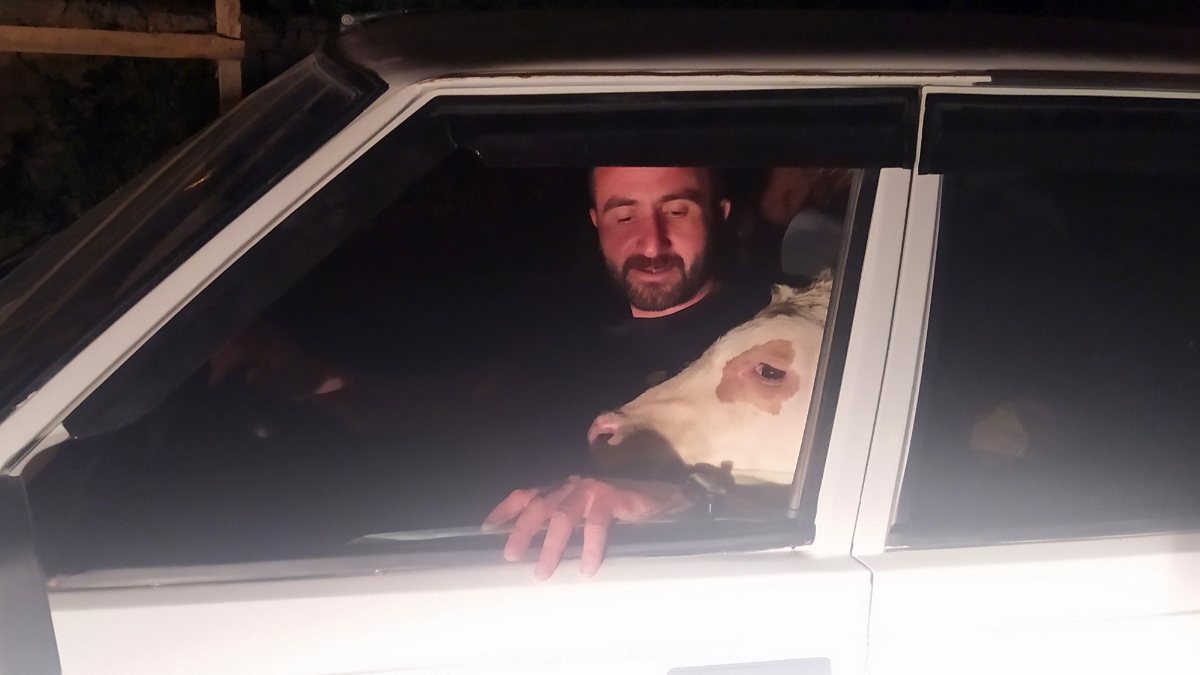 Buzağıyı aracına bindiren Koçyiğit, gezintiye başladı.
