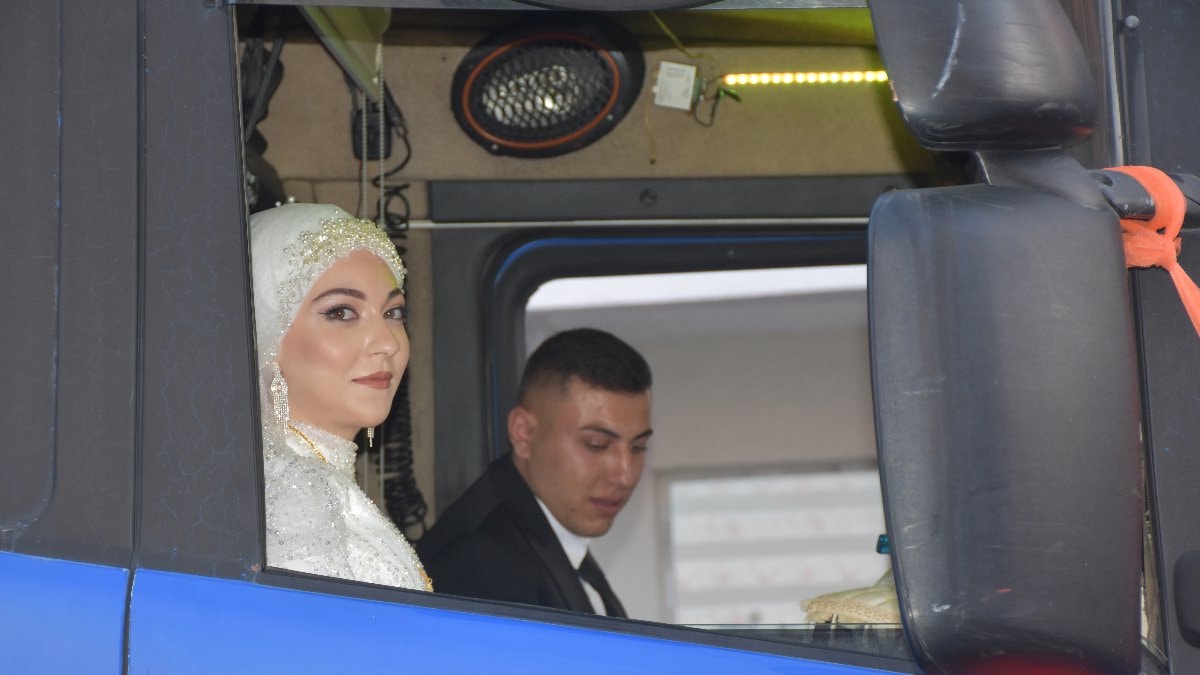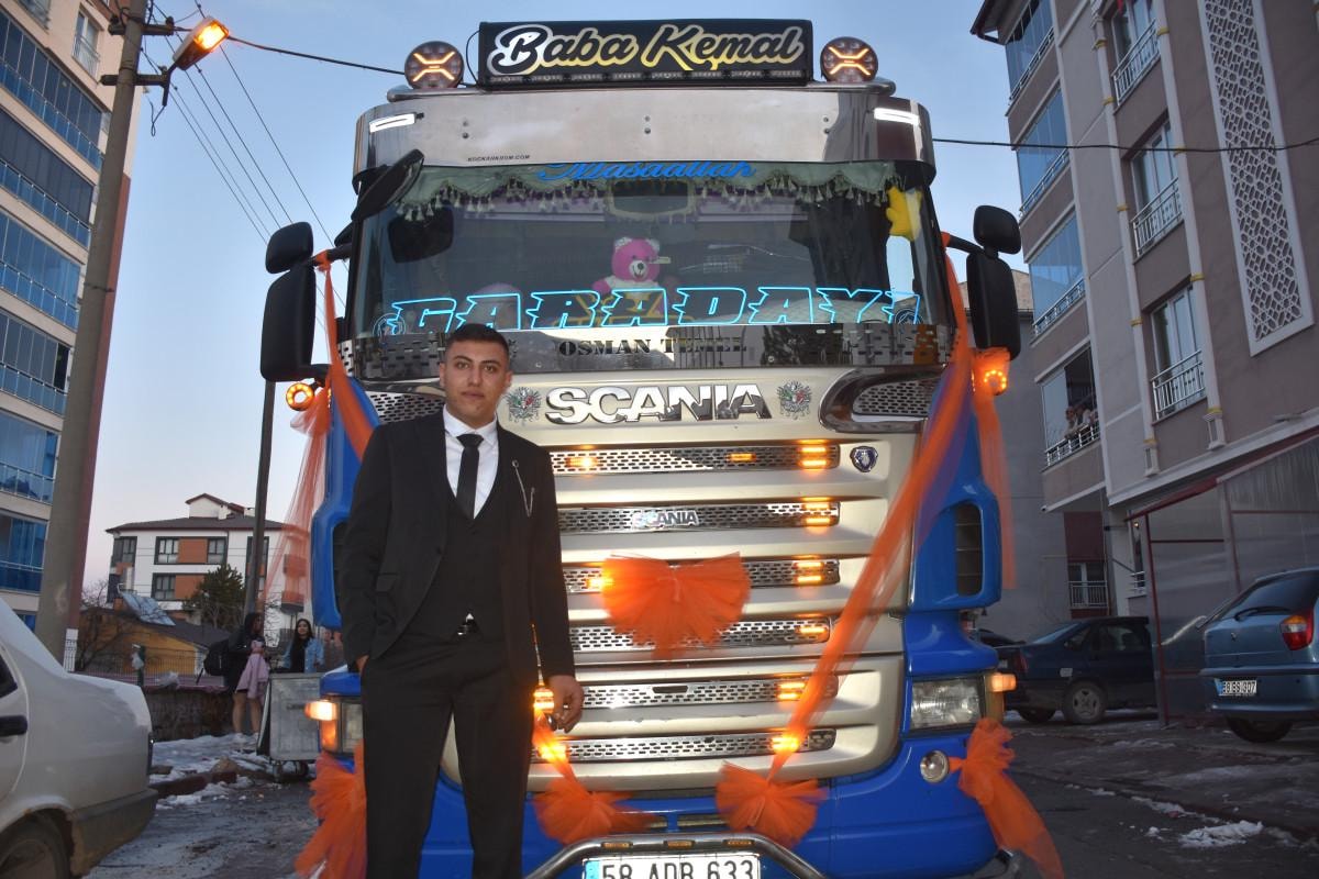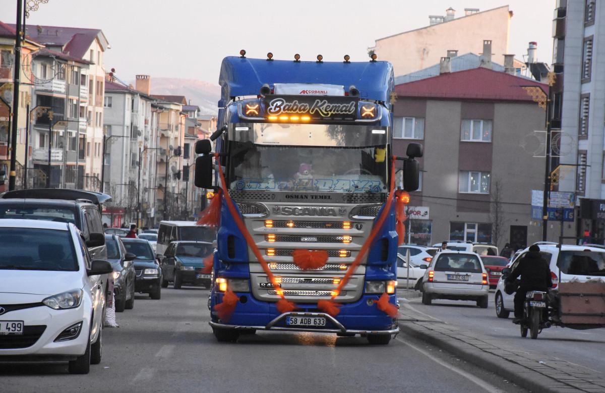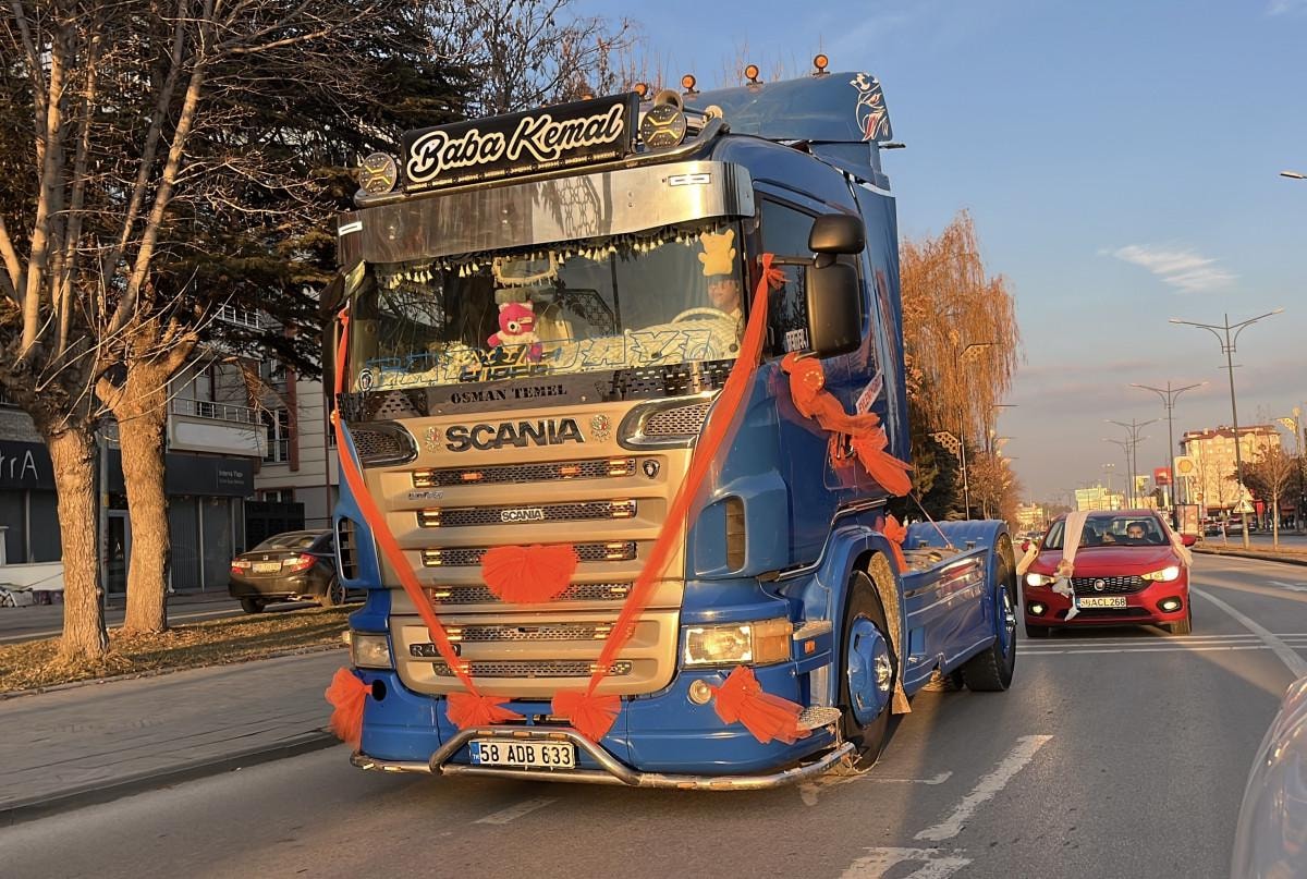 Kendi kullandığı tır çekicisini gelin arabası gibi süsleyen Temel, hayatını birleştirdiği Adalet Temel'i de yanına alarak, kentte akrabalarıyla birlikte konvoy yaptı.