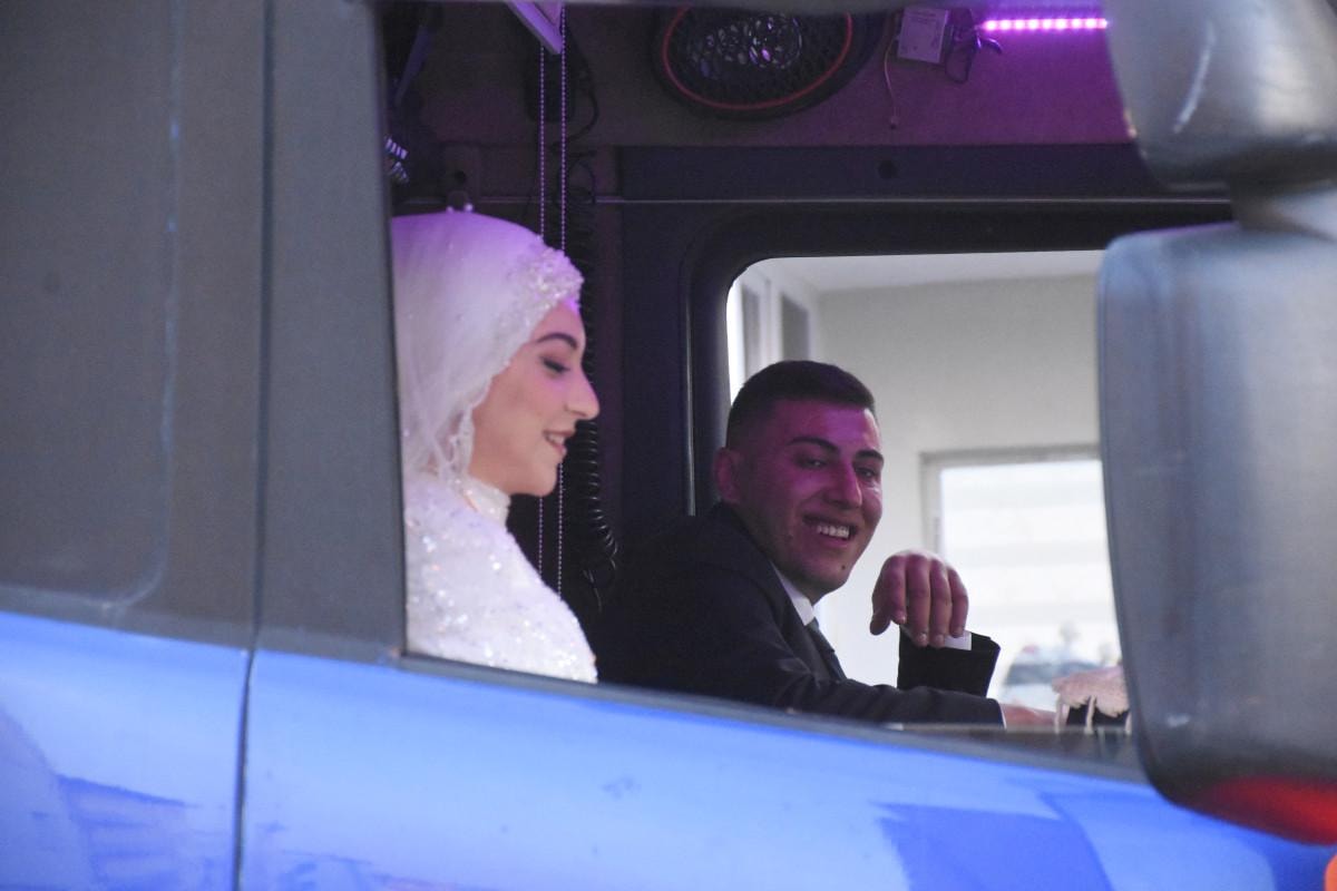 Çekici içinde gelin ve damadı görenler, şaşkınlık yaşadı. Bir süre kentte çekici ile dolaşan gelin ve damat, daha sonra düğünlerinin yapılacağı salona geçti.