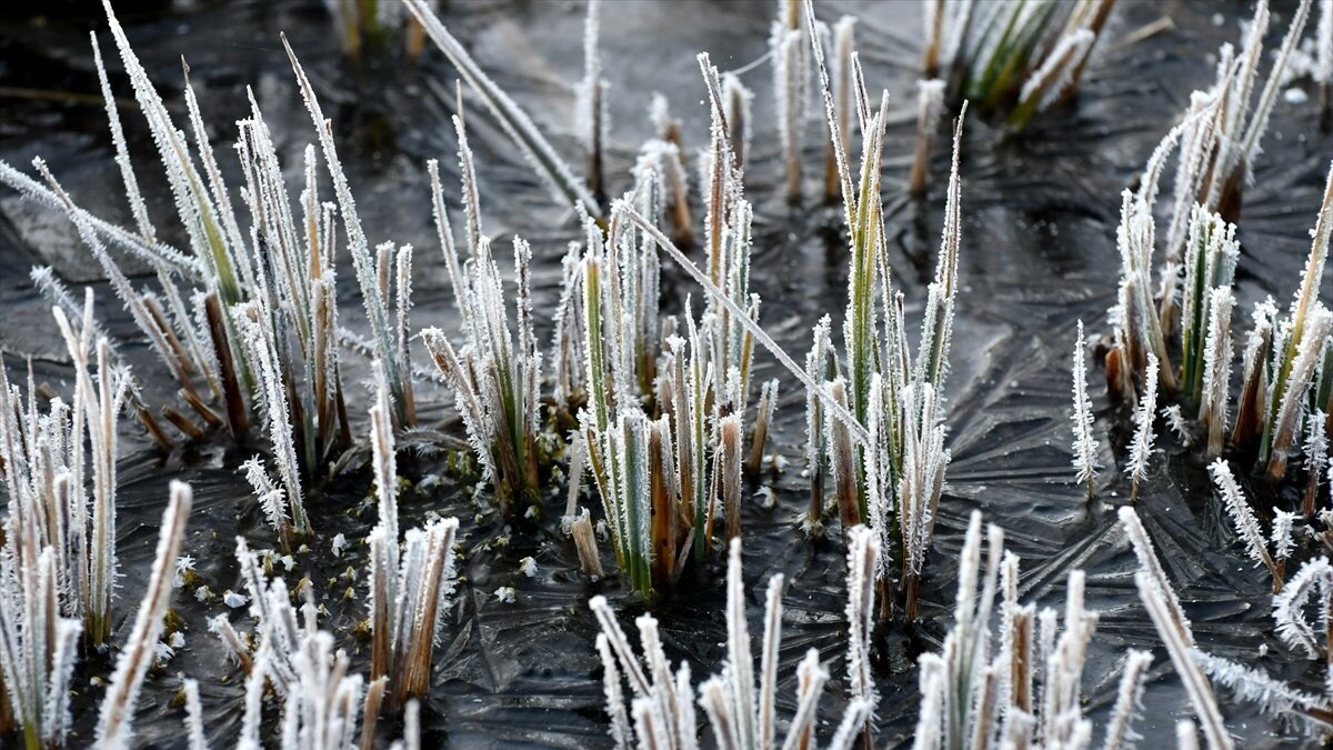 Erzincan'ın Üzümlü ilçesinde, soğuk hava nedeniyle kırağı tutan bitkiler güzel görüntü oluşturdu.