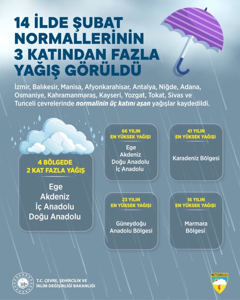 Çevre, Şehircilik ve İklim Değişikliği Bakanlığı, şubat ayı yağışlarının son 66 yılın en yüksek seviyesine ulaştığını açıkladı.
