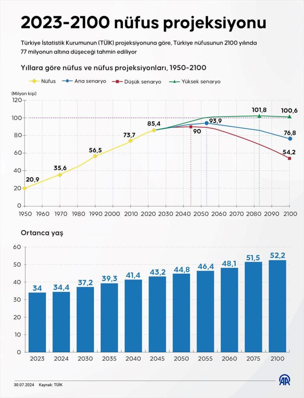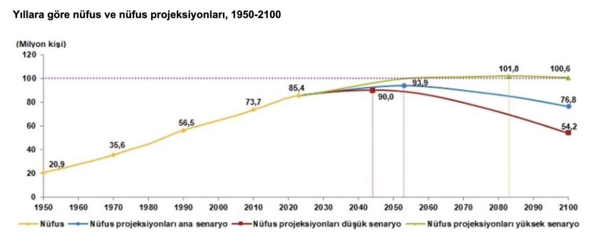 TÜİK verilerine göre, Türkiye nüfusunun 2050'li yılların ortasına kadar artması ve sonrasında azalışa geçmesi öngörülüyor ve 2100 yılında 77 milyonun altına düşeceği tahmin ediliyor.