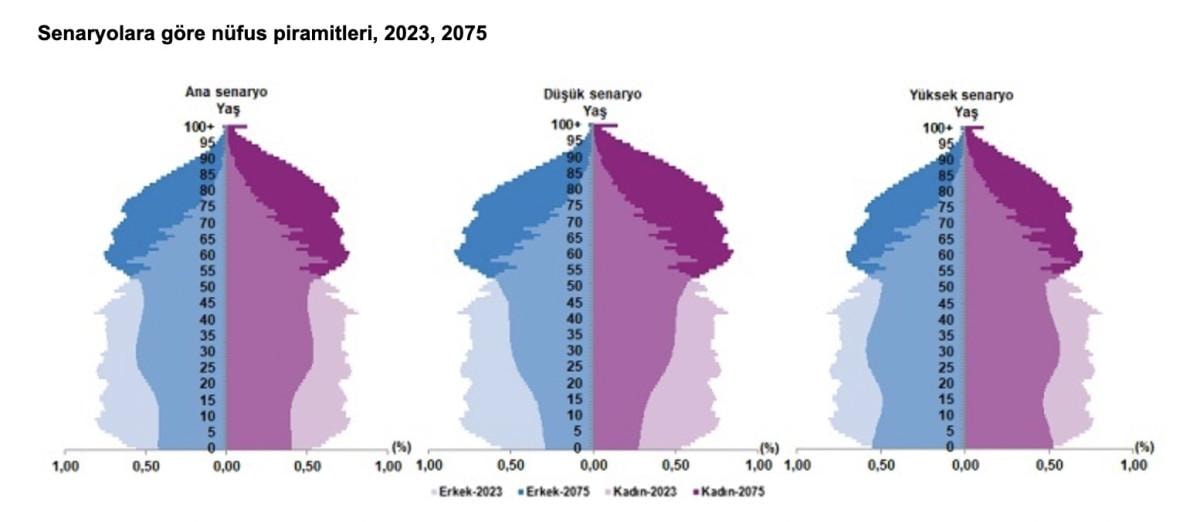 Nüfusun yaş ve cinsiyet yapısındaki değişimi gösteren nüfus piramitleri 2023 ve 2075 yılları için incelendiğinde, doğurganlıktaki değişim, yaşlı nüfustaki artış ile genç ve çalışma çağı nüfusundaki azalış üç senaryoda da görülüyor.