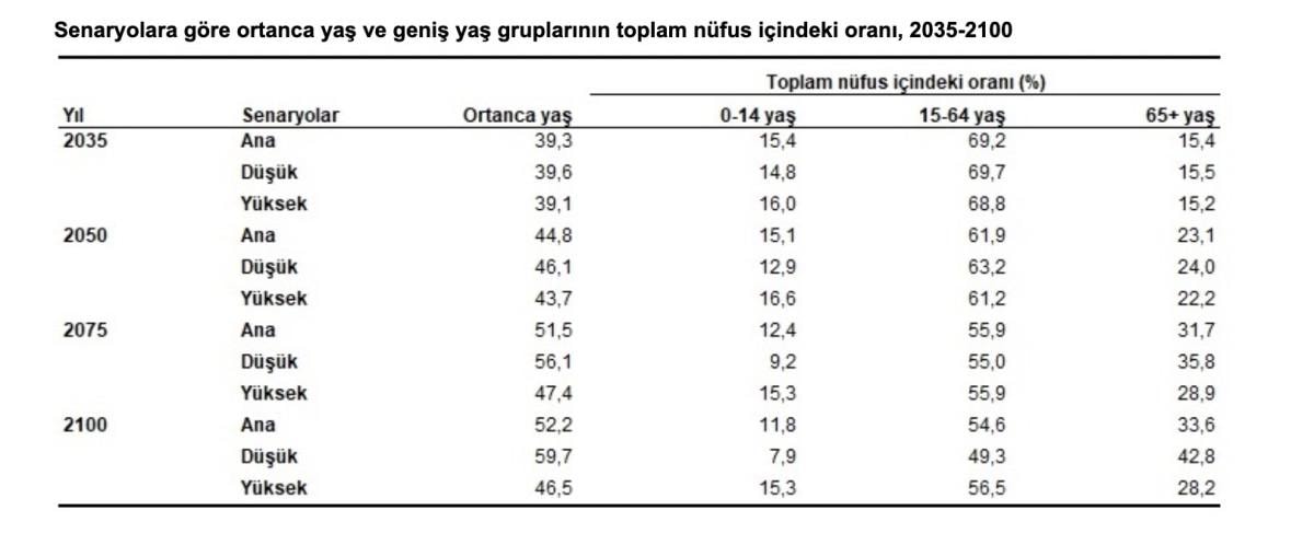 Türkiye'de doğuşta beklenen yaşam süresi artmakta ve nüfus yaşlanmaya devam ediyor. Nüfusun yaş yapısının önemli bir göstergesi olan ortanca yaş ile yaşlı nüfus olarak tanımlanan 65 ve üzeri yaştakilerin oranının tüm senaryolara göre artması bekleniyor.