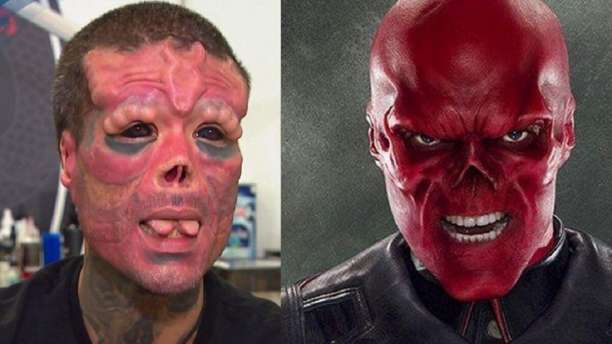 'Red Skull'a benzemek için gözlerinin içine kadar vücudunun birçok yerine dövme yaptıran Venezuelalı adam, burnunun bir kısmını aldırdı, yüzünü tamamen kırmızıya boyattı ve alnına boynuz ekletti.