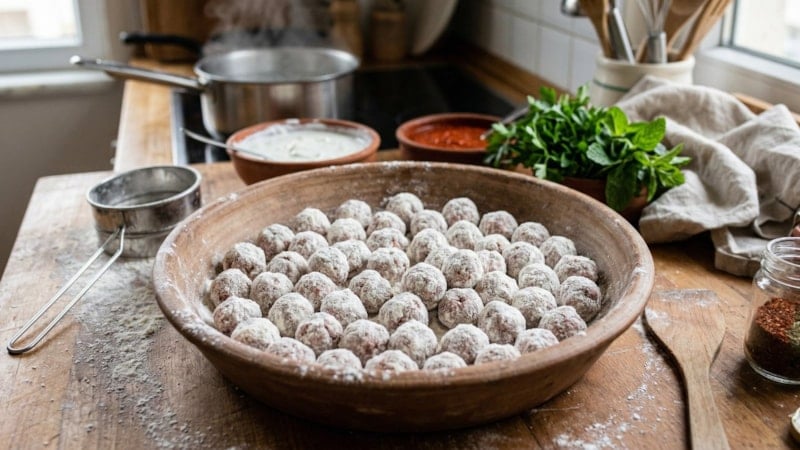 Ardından bu topları bol un bulunan bir kaba alıp kabı hafifçe sallayarak her bir parçanın unla tamamen kaplanmasını sağlıyorsunuz. Bu işlem sırasında kıymanın dışı adeta ince bir hamur tabakasıyla sarılıyor.