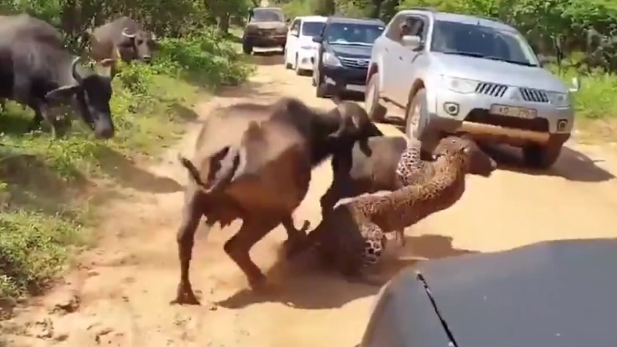 Diğer büyükbaş hayvanlar, yavrularını korumak için leoparı engellemeye ve tekmelemeye başladı.