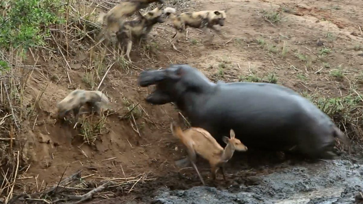 O sırada yaklaşan su aygırı, köpeklerin uzaklaşmasını sağladı. Çamura girerek su aygırına sığınmak isteyen geyik ise hiç beklemediği bir durumla karşılaştı.